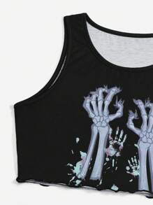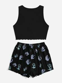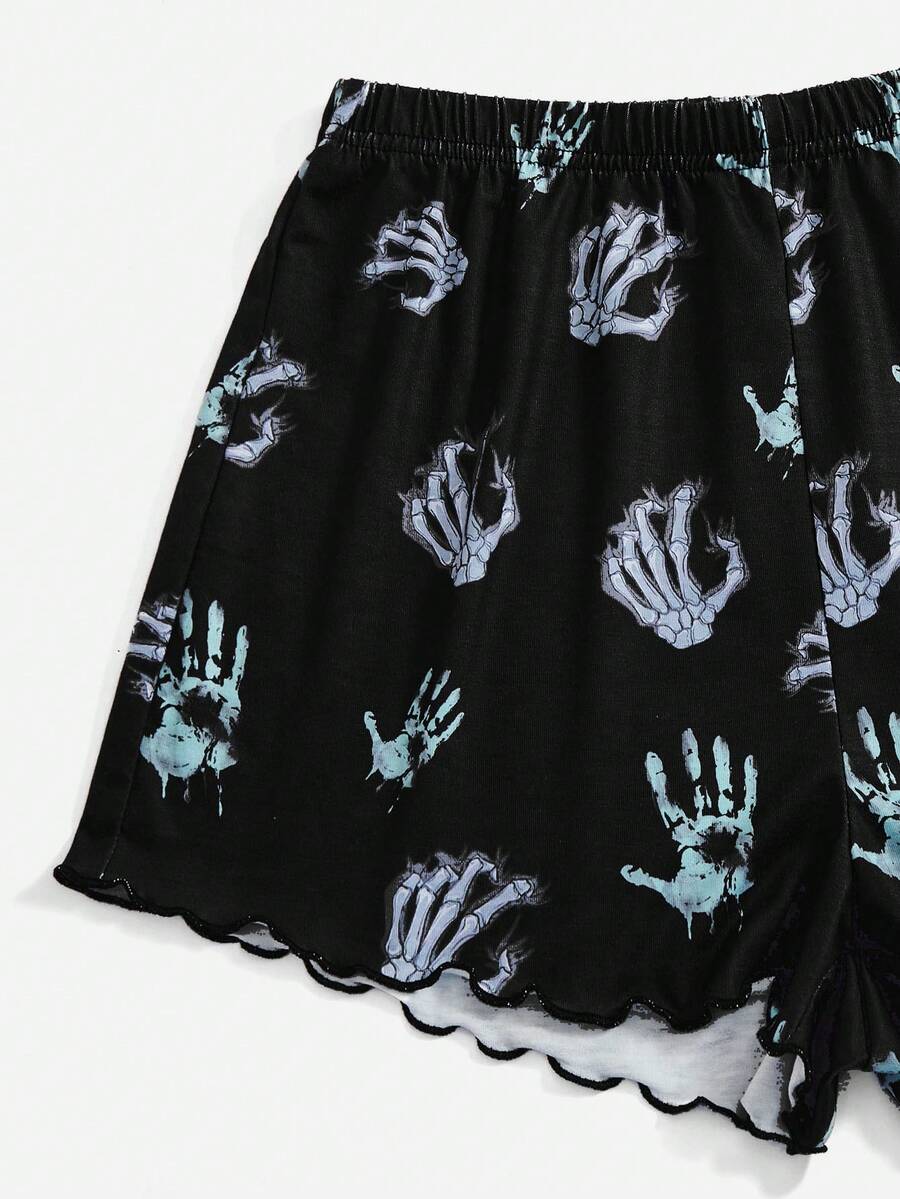 Grunge Punk Hand Skeleton Print Lettuce Trim PJ Set