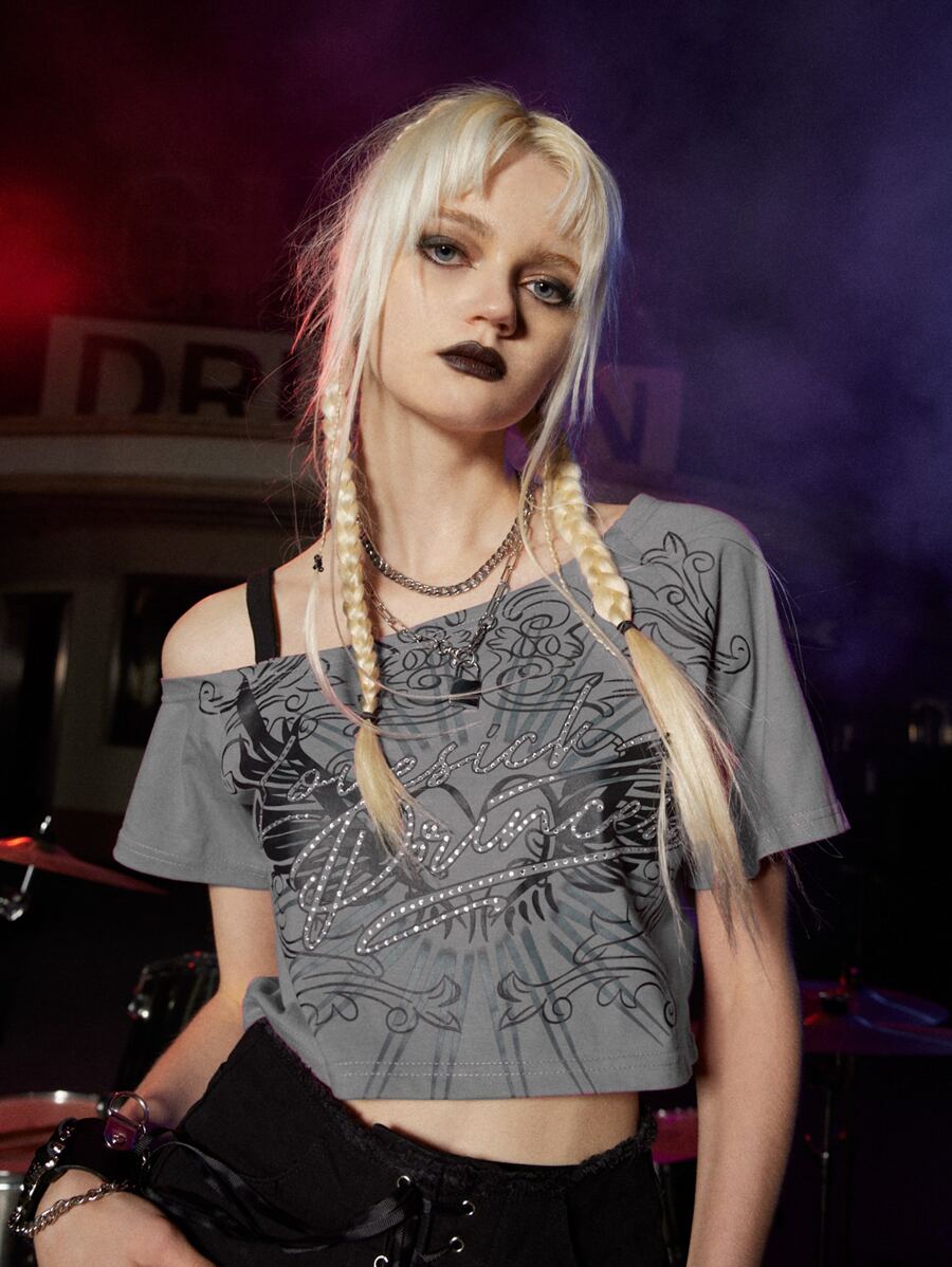 Grunge Punk Kpop Heart Letter Rhinestone Cold Shoulder Tee