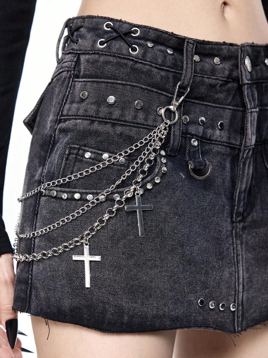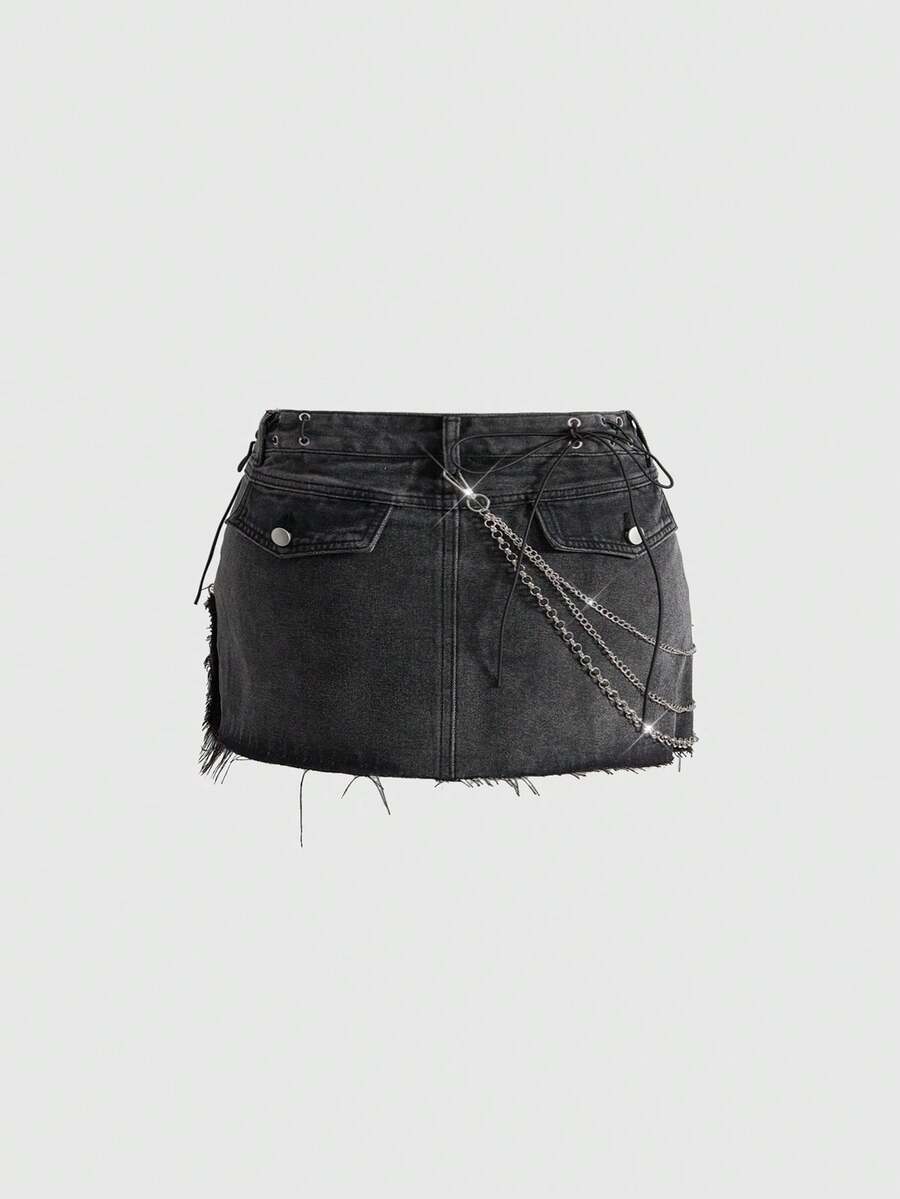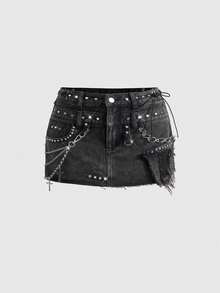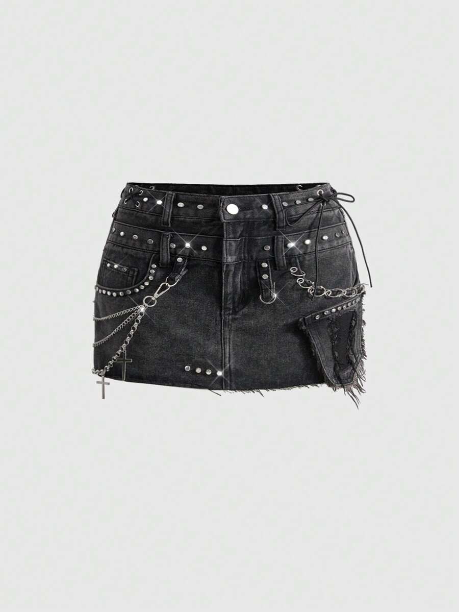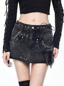 Grunge Punk Kpop Punk Metal Rivet & Chain Distressed Washed Mini Denim Skirt