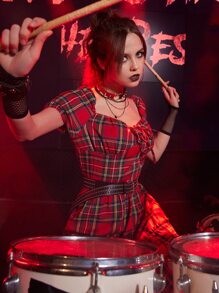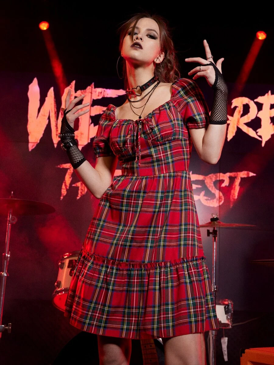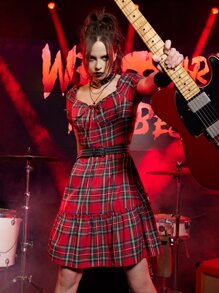 Grunge Punk Kpop Tartan Knot Puff Sleeve Dress