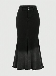 Grunge Punk Ladies Gradient Washed Denim Mermaid Skirt With Frayed Hem