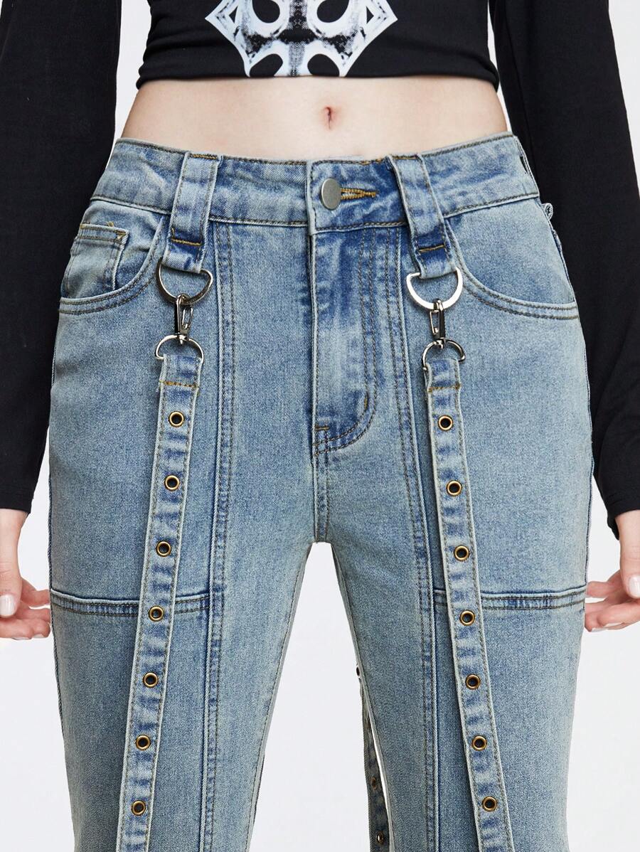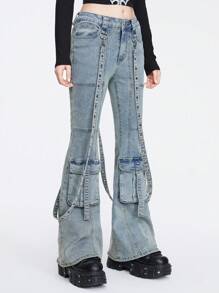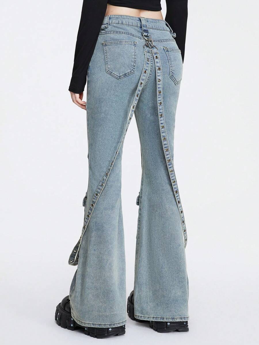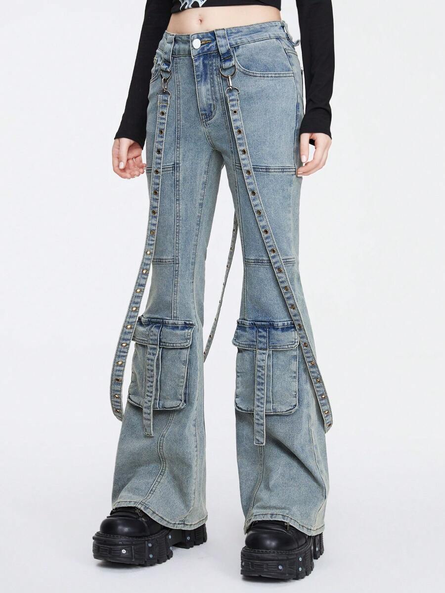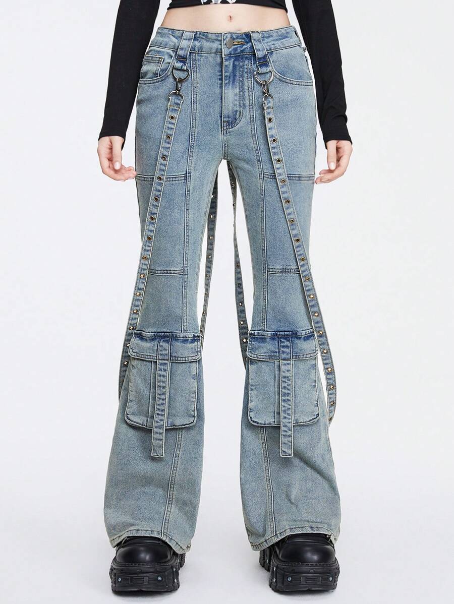 Grunge Punk Ladies' Heavy Metal Punk Style Workwear With Rivets Decor, 3D Pockets, Cut And Stitching Design Flared Jeans