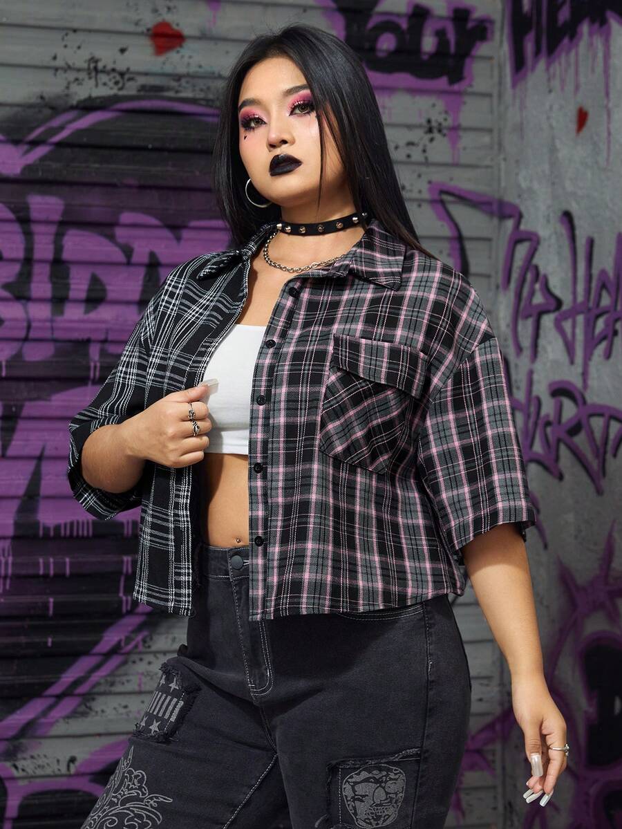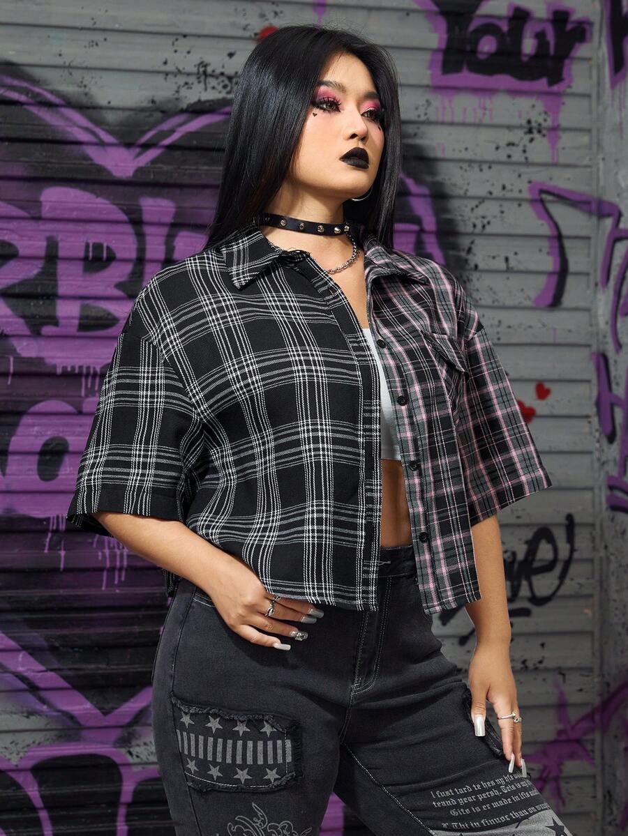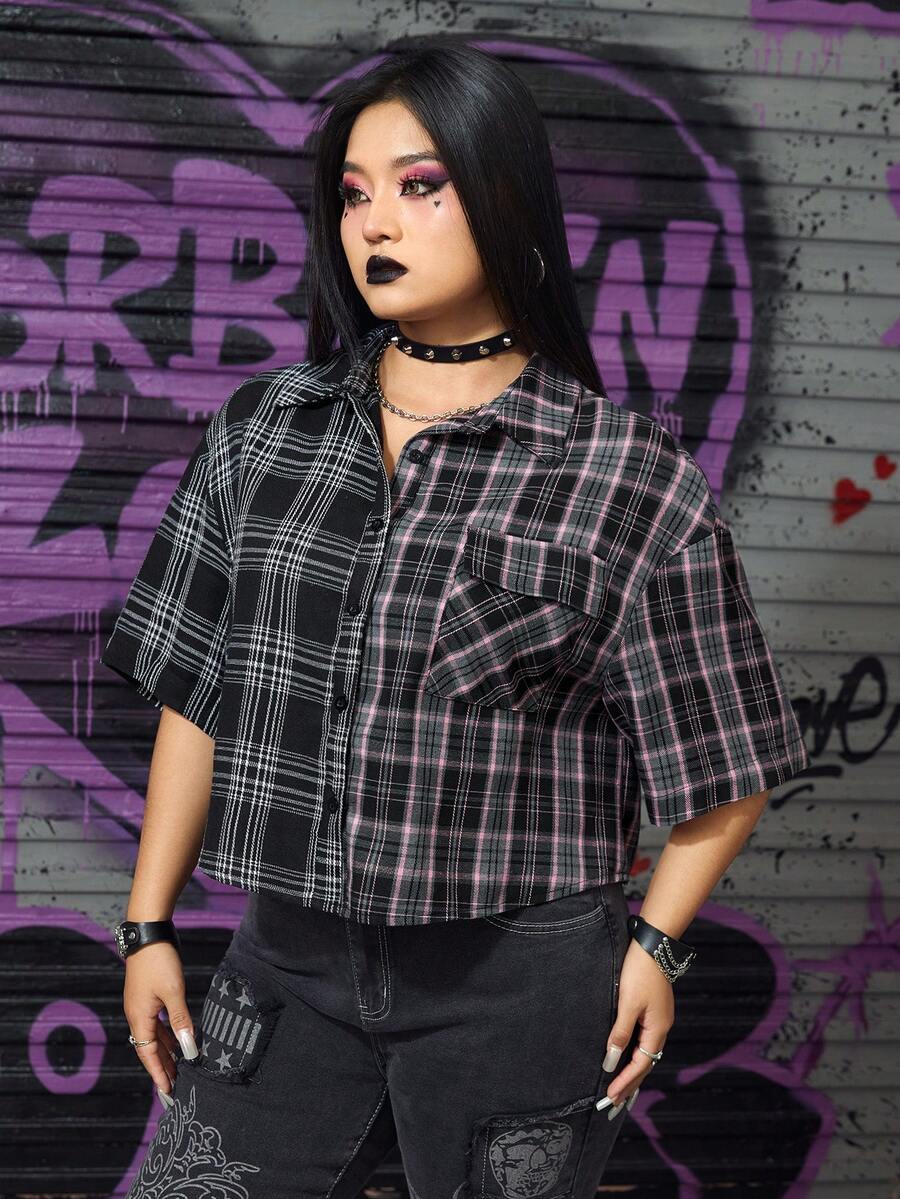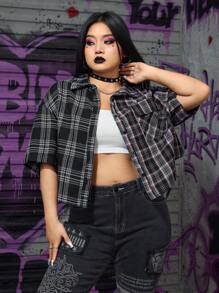 Grunge Punk Leisure Punk Plaid Color Block Plus Size Women's Short Shirt