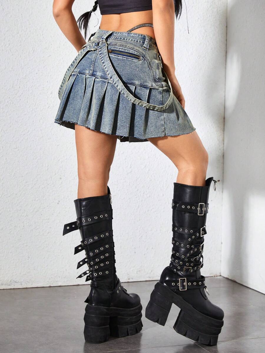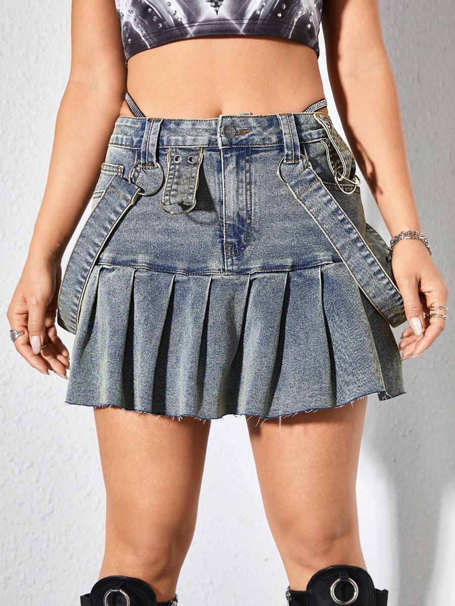 Grunge Punk Light Washed Vintage Style Denim Skater Skirt With Double Suspenders And Pleated Hem For Women