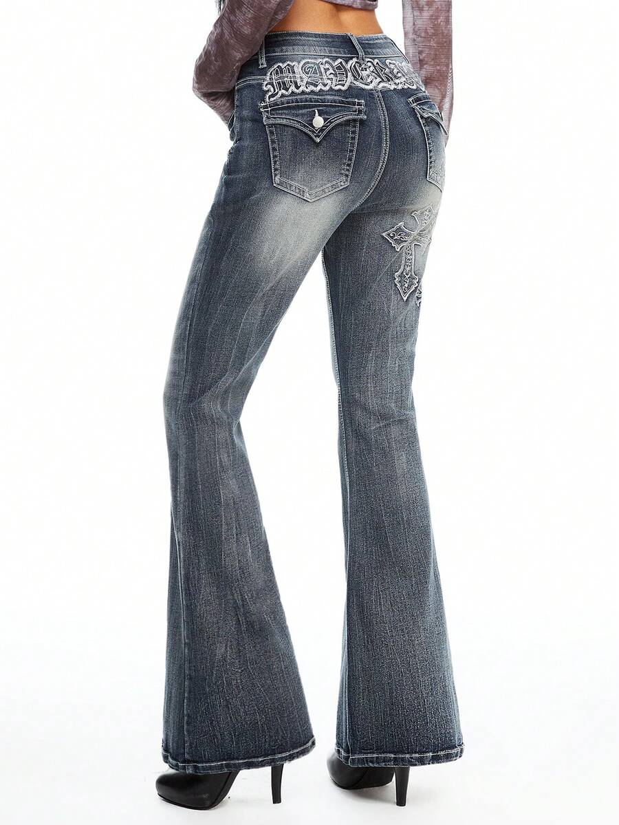 Grunge Punk Low Rise Y2K Retro Distressed Back Embroidered Cross Flare Denim Jeans