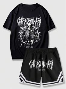 Grunge Punk Men Skeleton Letter Graphic Tee & Shorts, School, Halloween