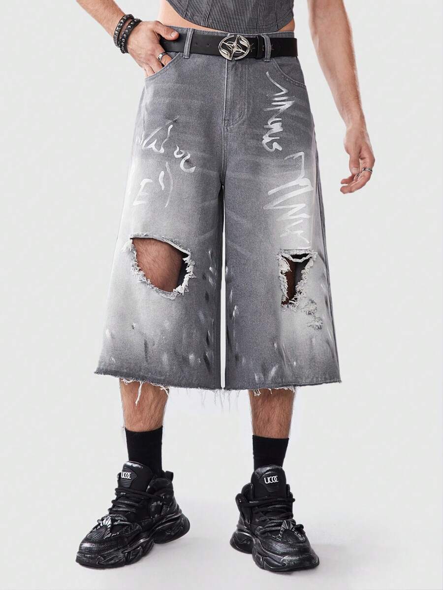 Grunge Punk Men's Distressed Hand Painted Denim Shorts Suitable For Daily Wear In Spring And Summer