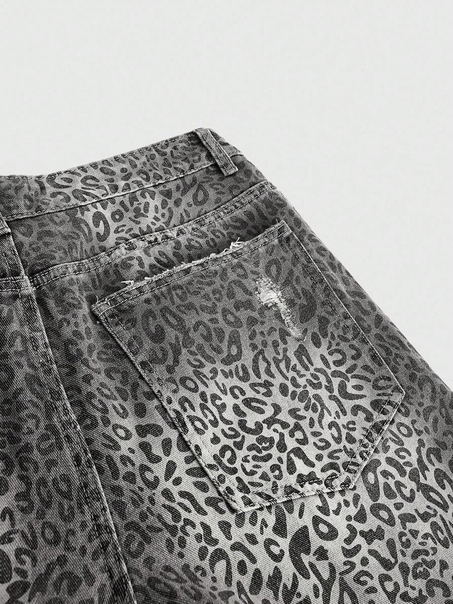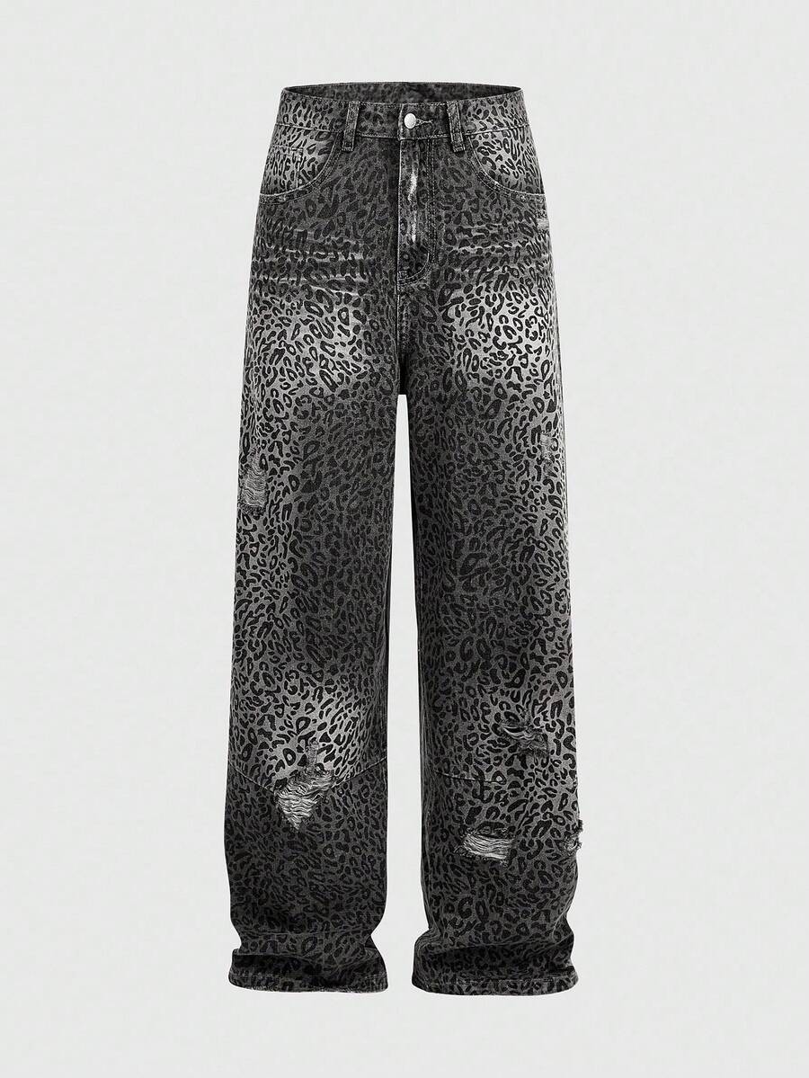 Grunge Punk Men's Leopard Print Pocket Ripped Loose Fit Casual Jeans