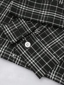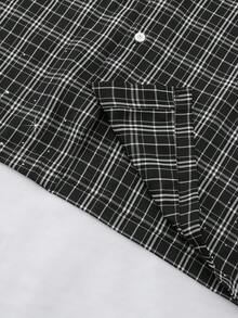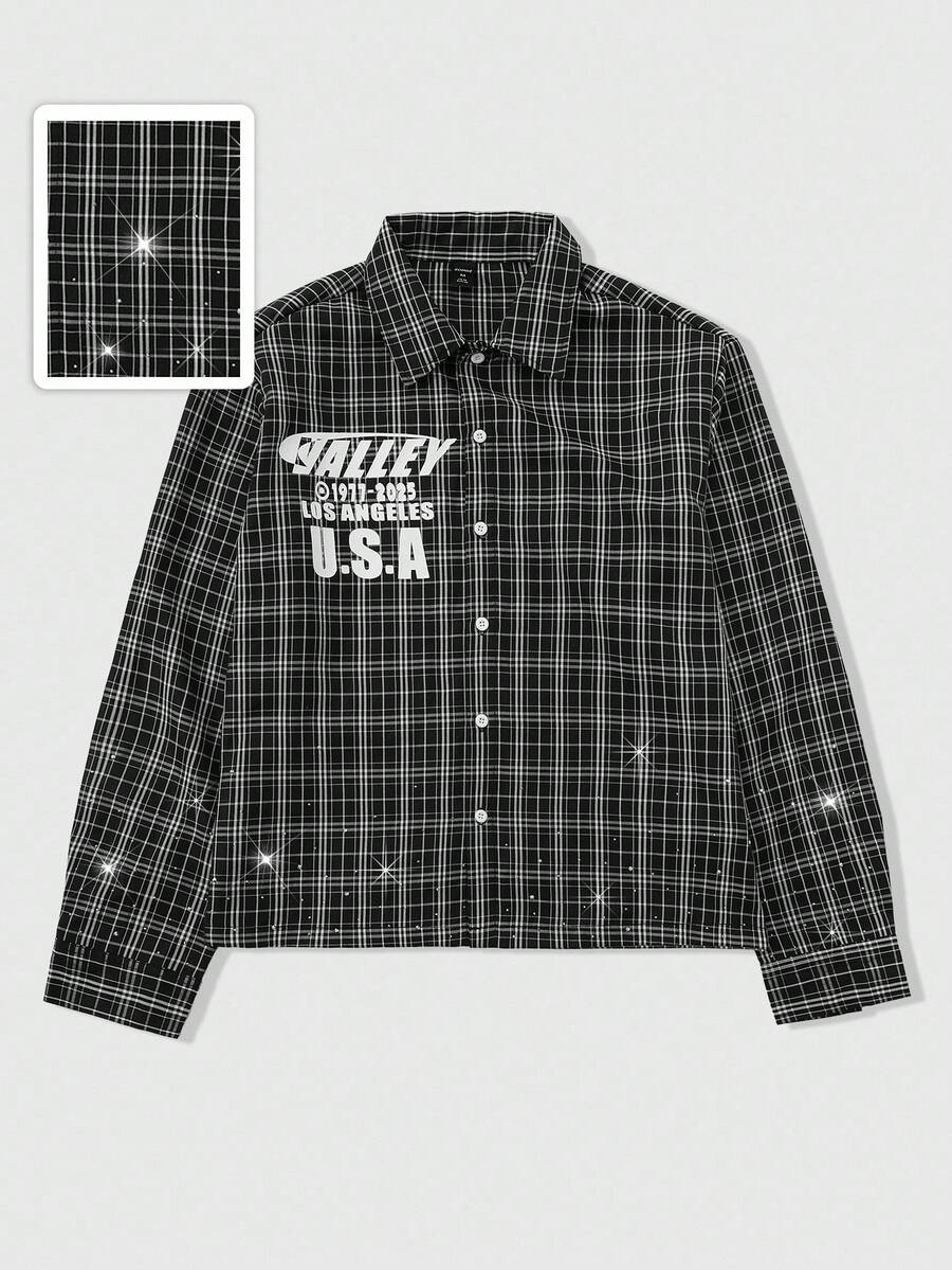 Grunge Punk Men's Letter Print Long Sleeve Casual Short Plaid Rhinestone Embellished Shirt, For Fall