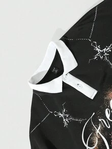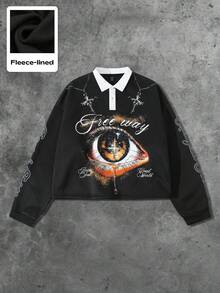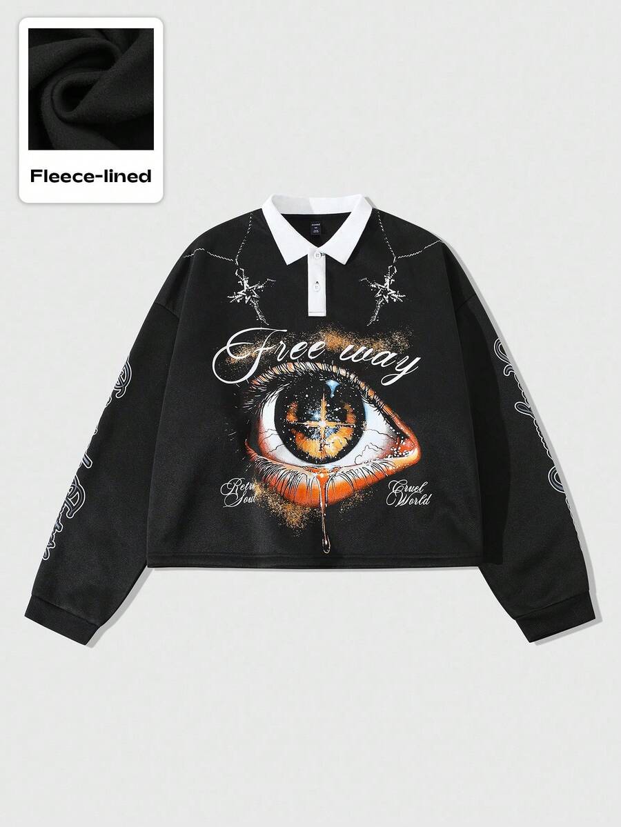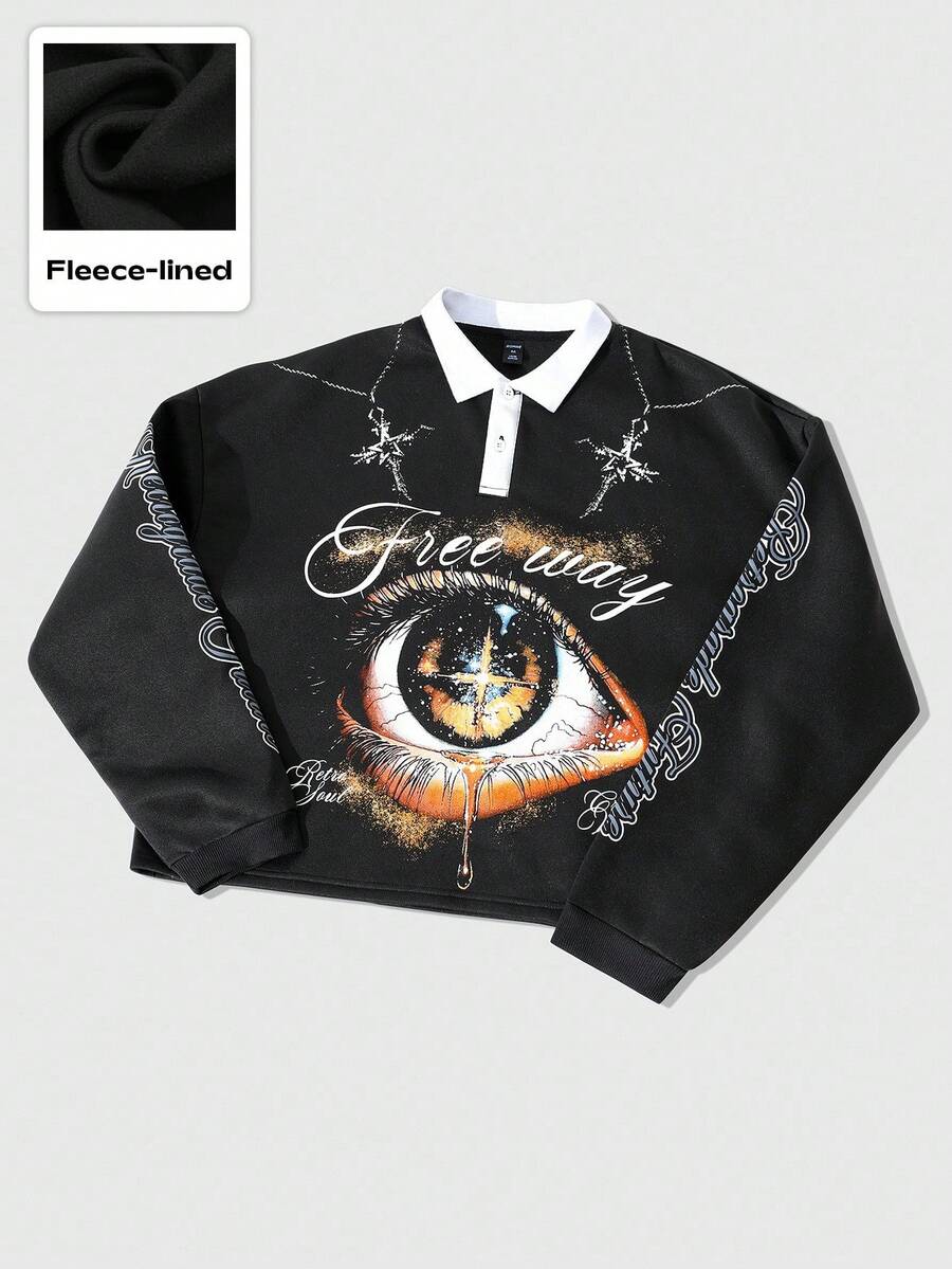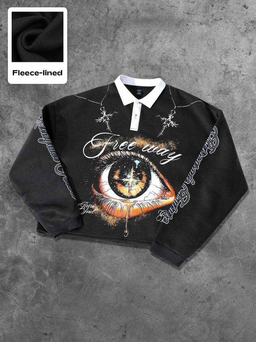 Grunge Punk Men's Loose Fit Long Sleeve Eye Print Polo Shirt, Autumn, For Fall