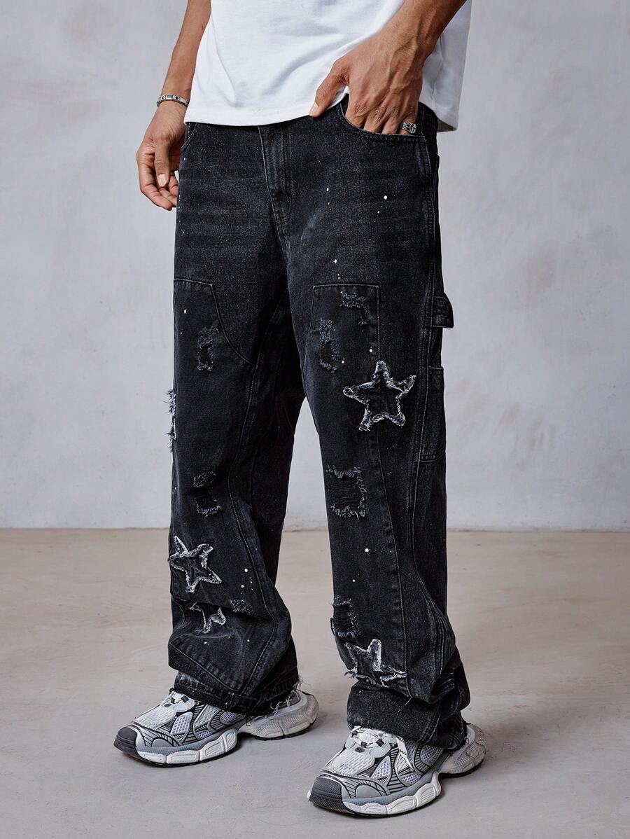 Grunge Punk Men's Pentagram Patch Pocket Wide-Leg Casual Jeans