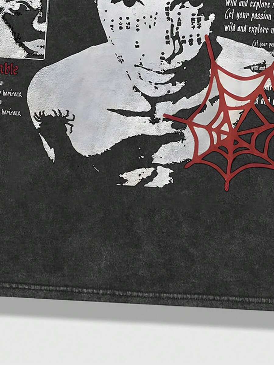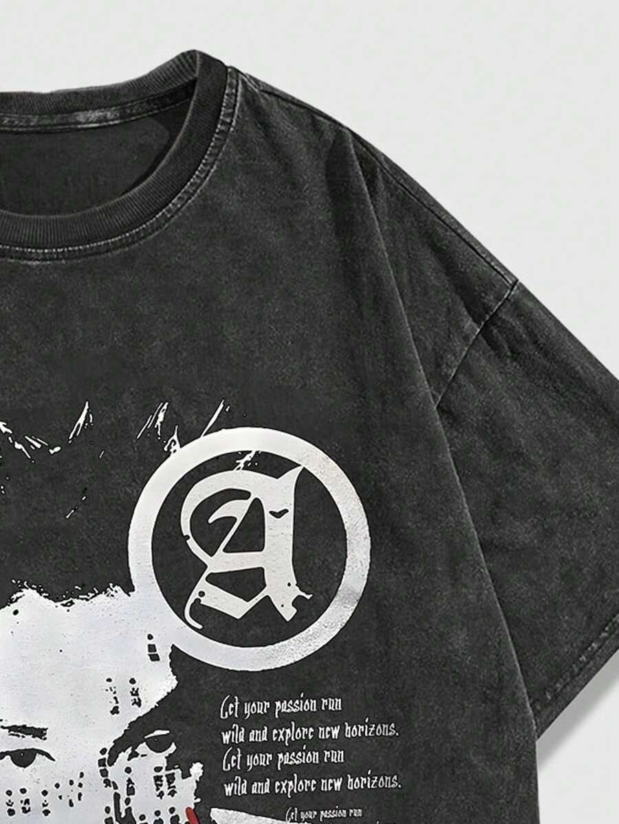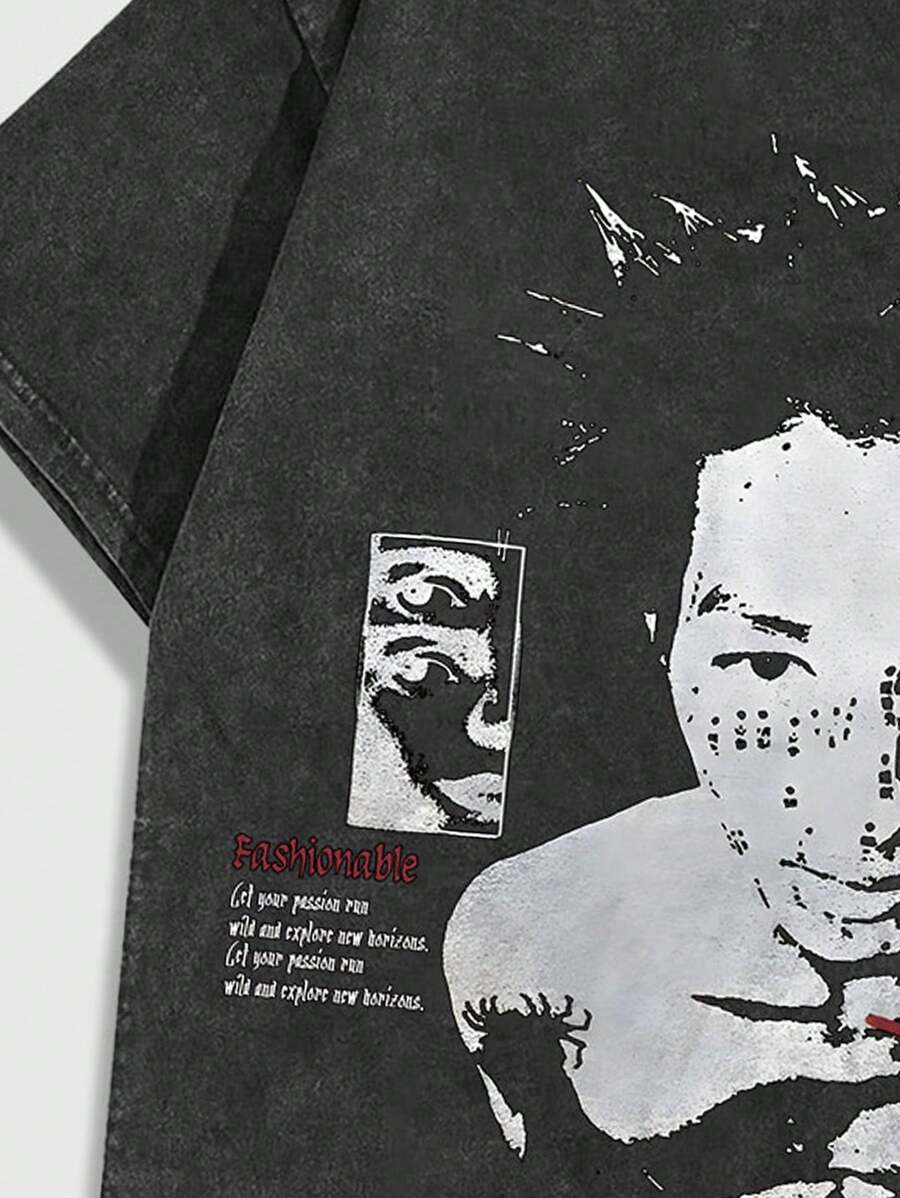 Grunge Punk Men's Vintage High Street Washed T-Shirt With Blurred Portrait Print