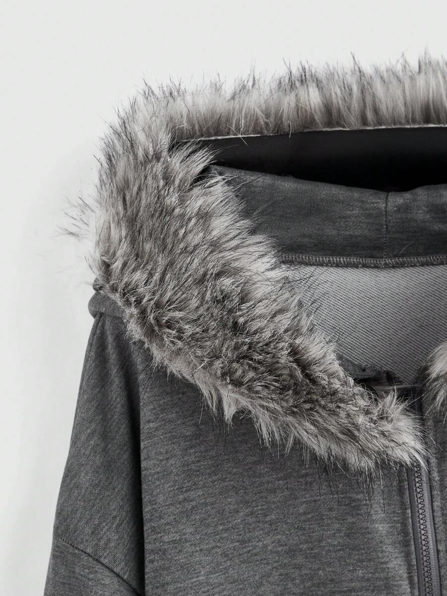 Grunge Punk Music Festival Street Rock Rhinestone Cross Detachable Faux Fur Collar Loose Open Front Hoodie For Women