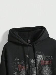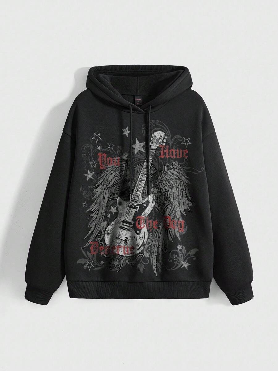 Grunge Punk Oversized Street Music Festival Guitar Star Slogan Red & Gray Vine Vintage Pattern Hoodie With Pocket For Women