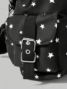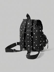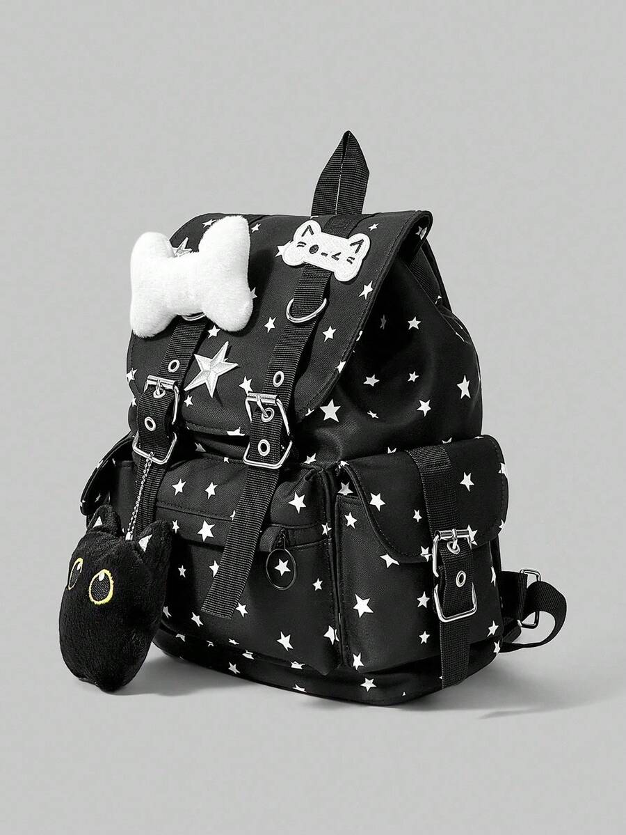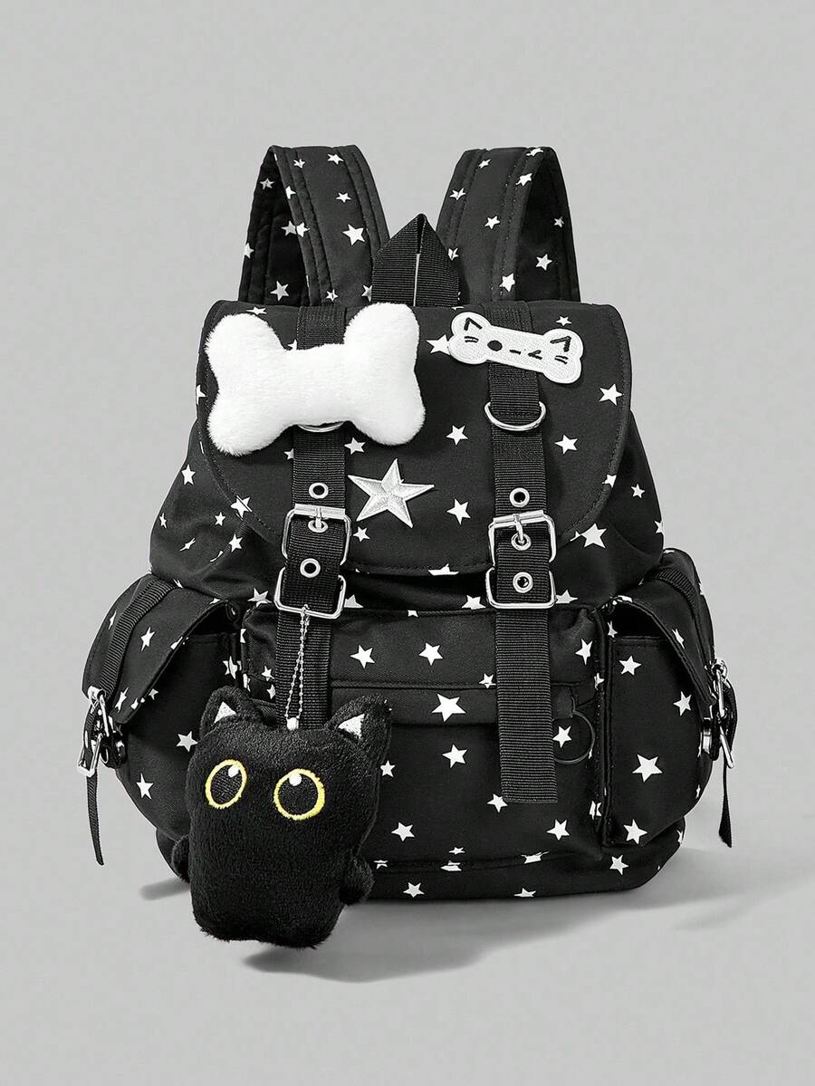Grunge Punk Pentagram Bone Black Cat Plush Pendant Decor Multi-Pocket Star Black Backpack, Fashionable Casual Unisex Large Capacity Backpack Suitable For Commuting And School