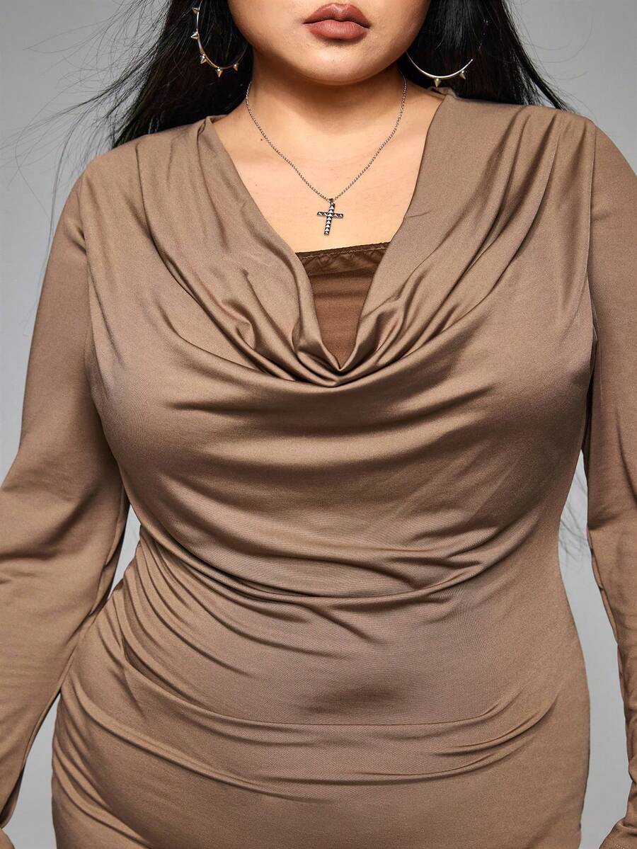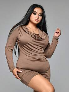 Grunge Punk Plus Size Brown Grunge-Punk Street Style Colorblock 2 In 1 Crew Neck Long Sleeve Bodycon Dress, Autumn/Winter Plus Size Women Bodycon Layering Dress, Casual Y2K J-Fashion Dress