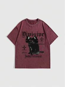 Grunge Punk Plus Size Cat Printed Short Sleeve T-Shirt, Round Neck, Casual Daily Wear