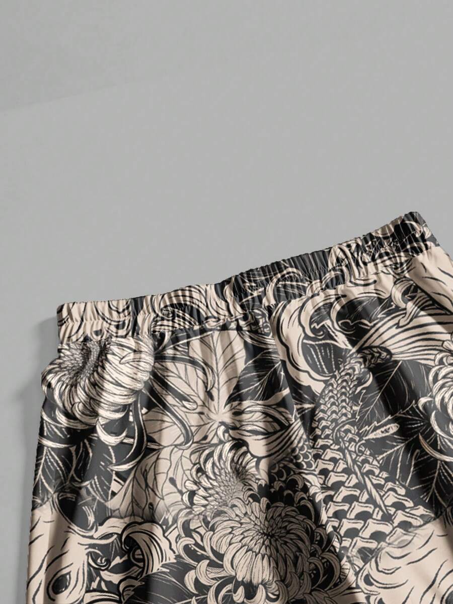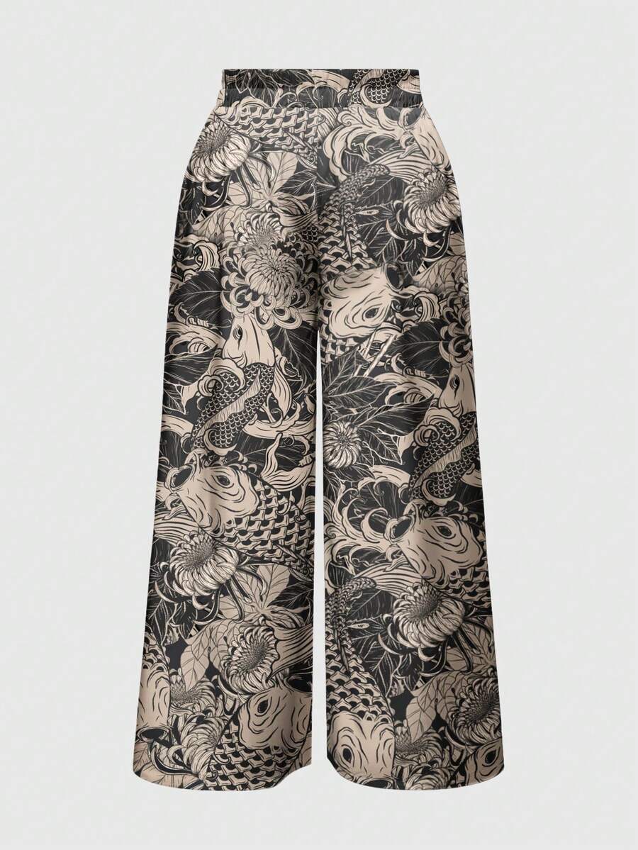 Grunge Punk Plus Size Chinese Ink Painting Fish Print Loose Wide Leg Pants