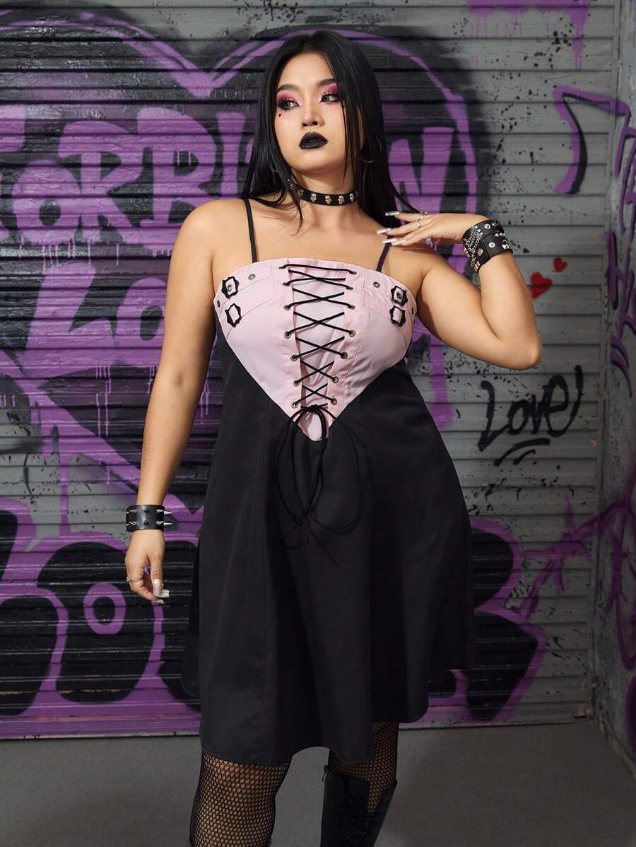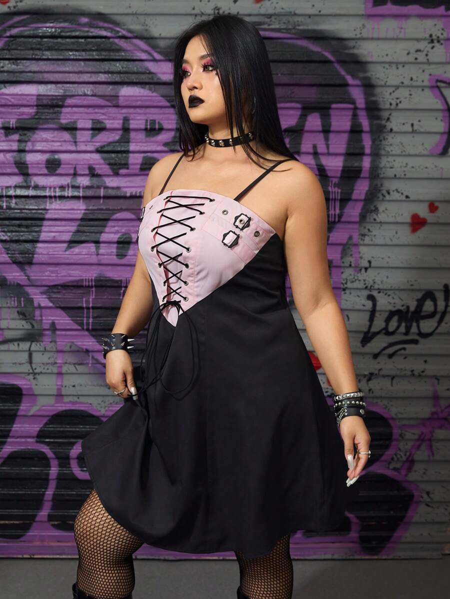 Grunge Punk Plus Size Color-Block Cami Dress With Metal Cowl Neck Detail, Black & Pink