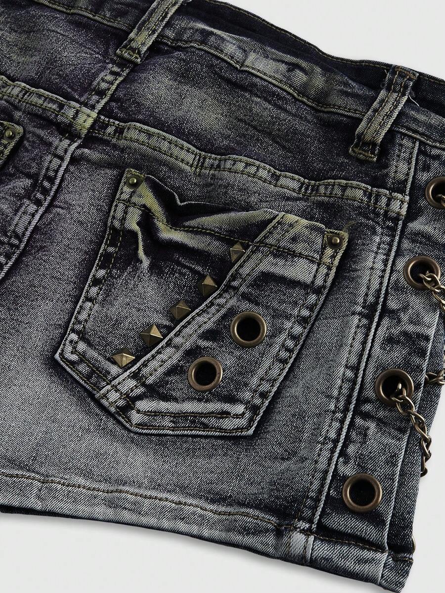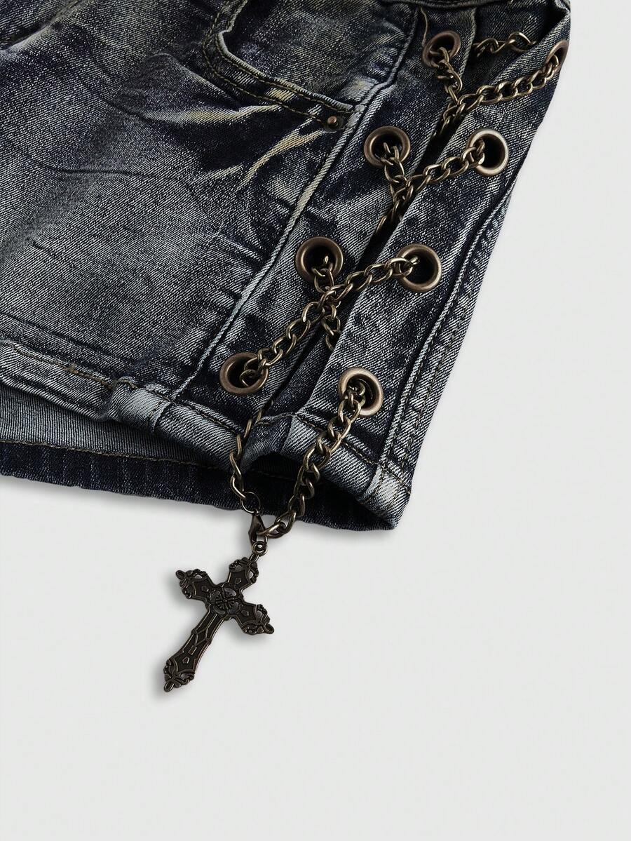 Grunge Punk Plus Size Distressed Vintage Washed Side Metal Cross Pendant Low Waist Mini Denim Shorts
