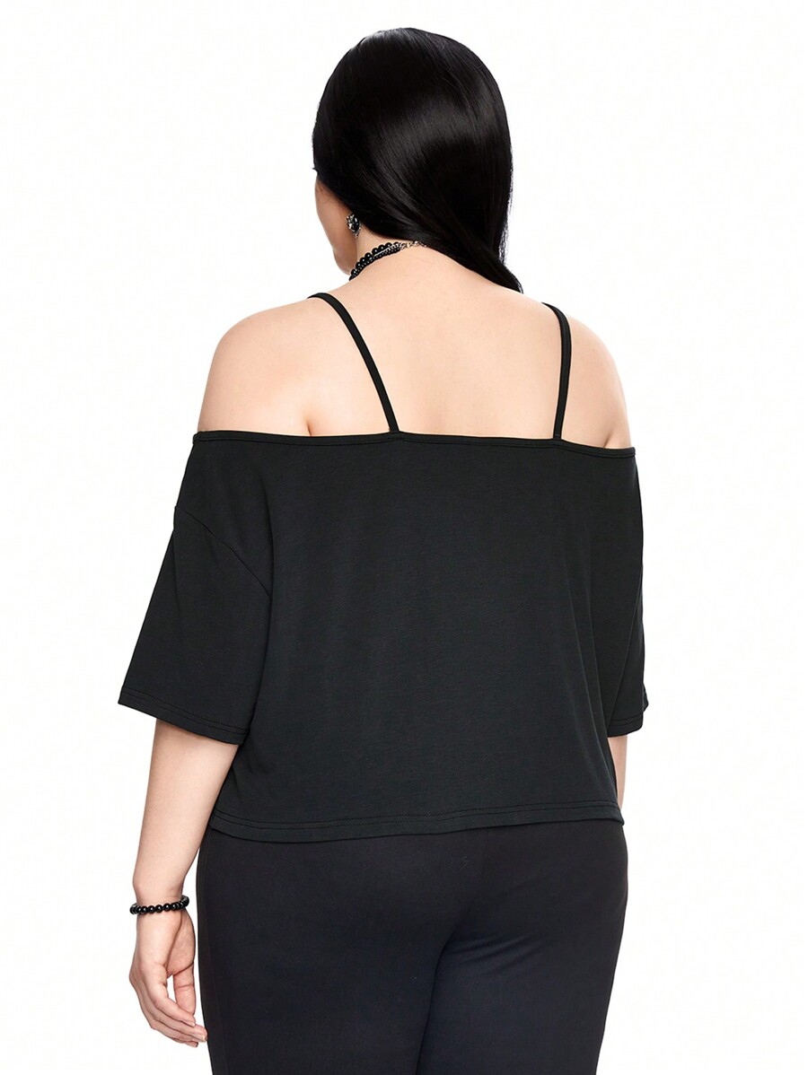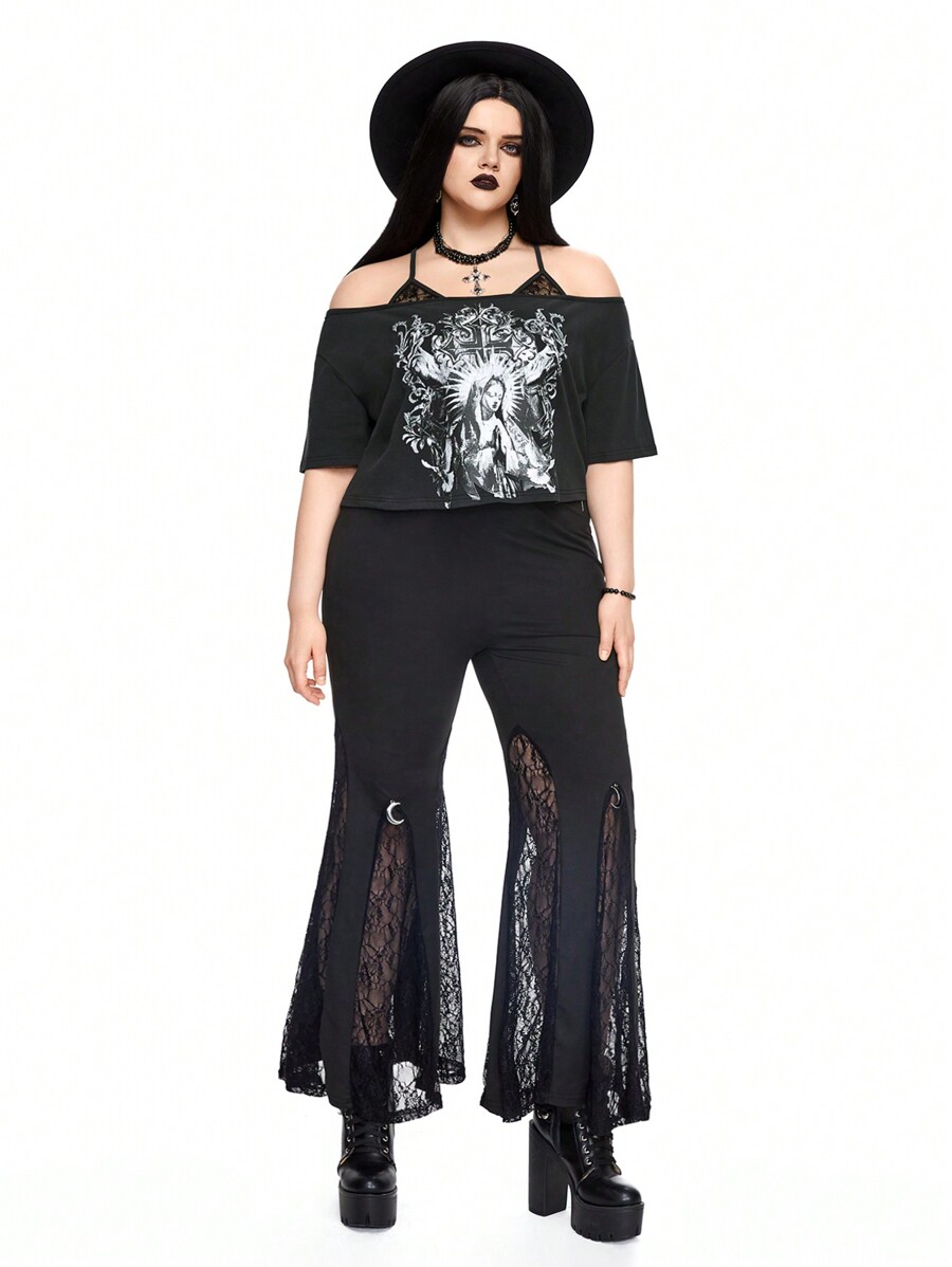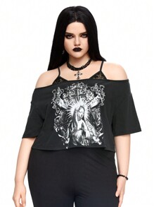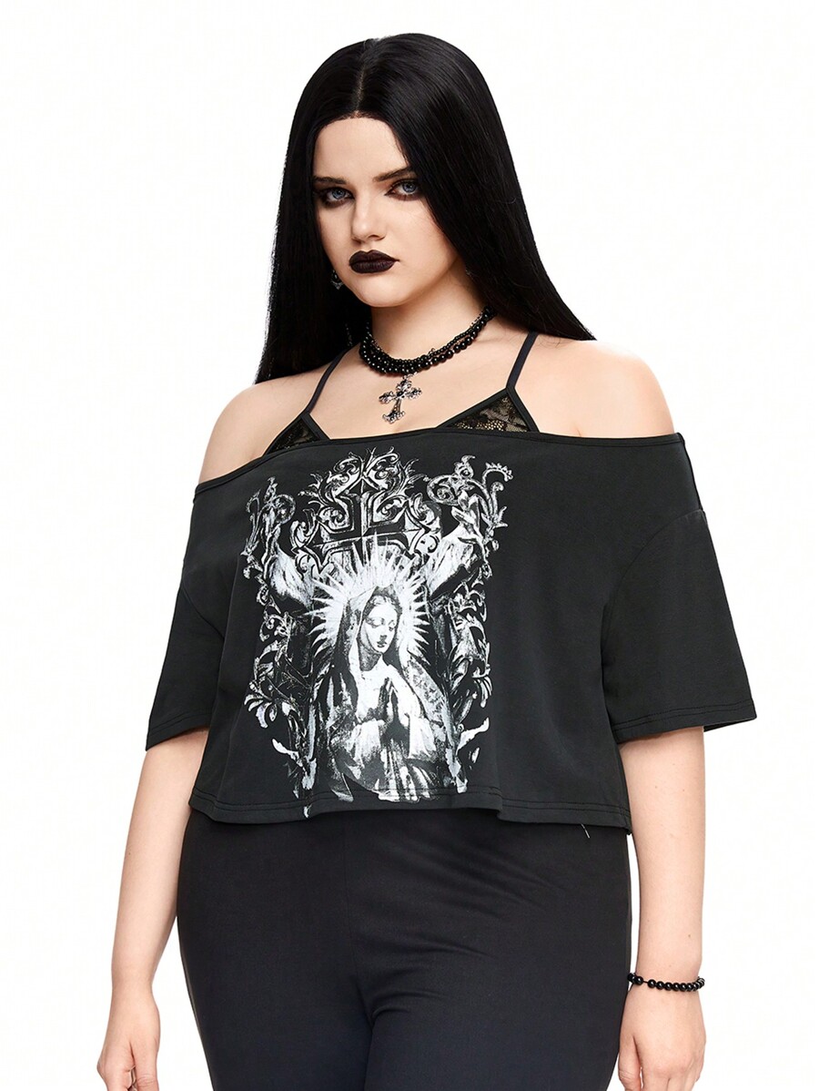 Grunge Punk Plus Size Gothic 2 In 1 Virgin Mary Printed Short Sleeve T-Shirt, School