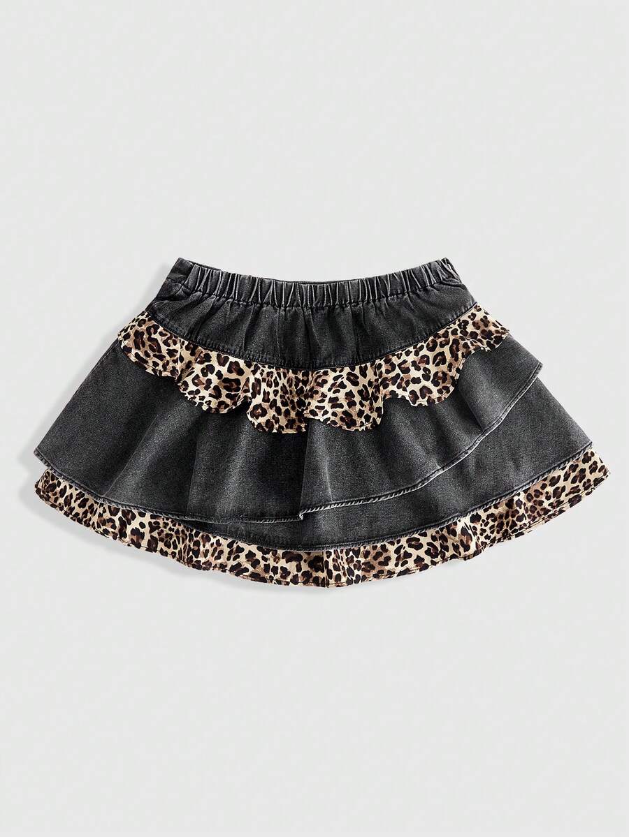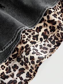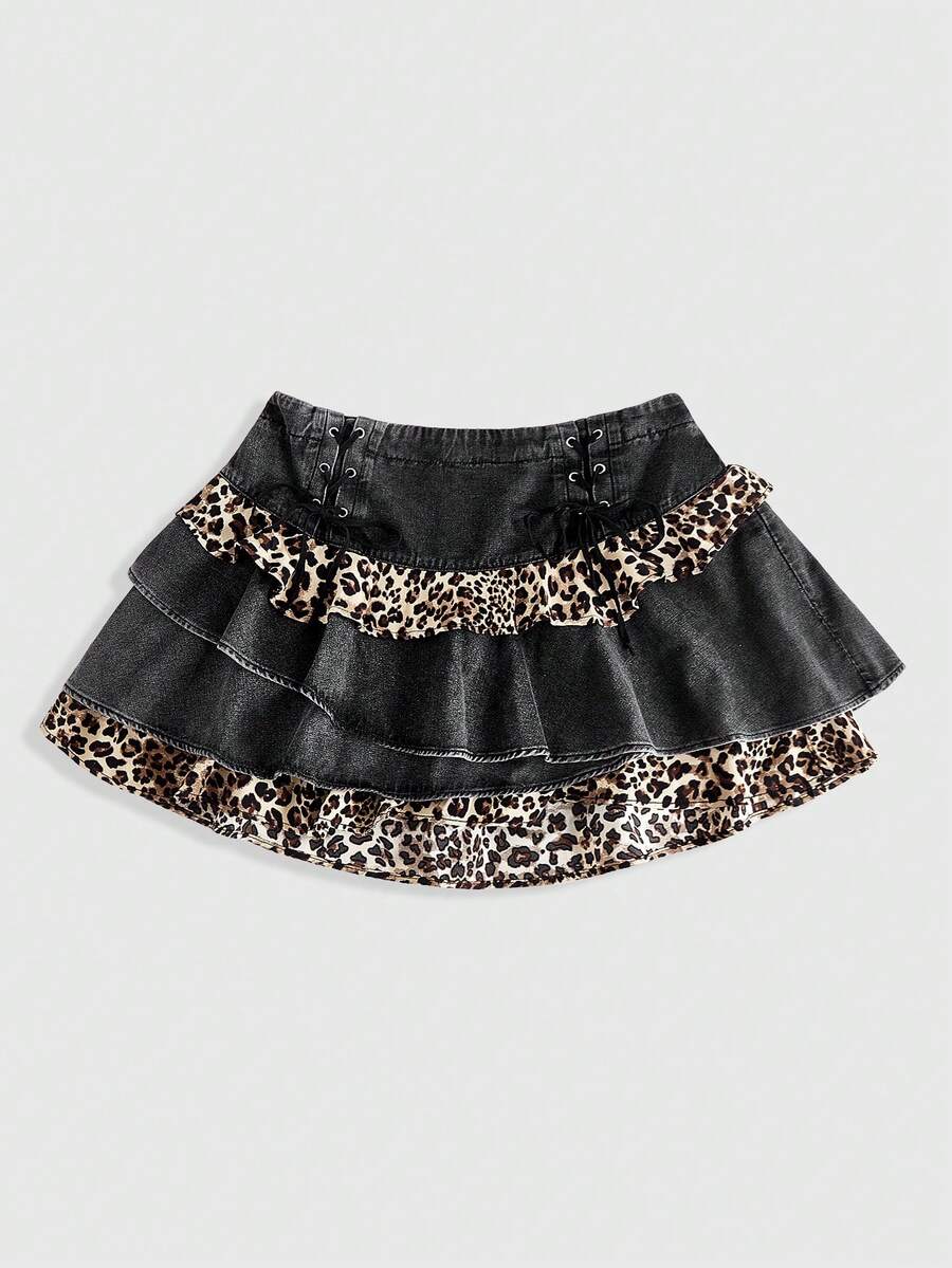 Grunge Punk Plus Size Kpop Grunge-Punk Leopard Print Denim Skirt, Vintage Washed Versatile Denim Mini Skirt, Autumn/Winter Plus Size Kpop Denim Punk Rock Skirt