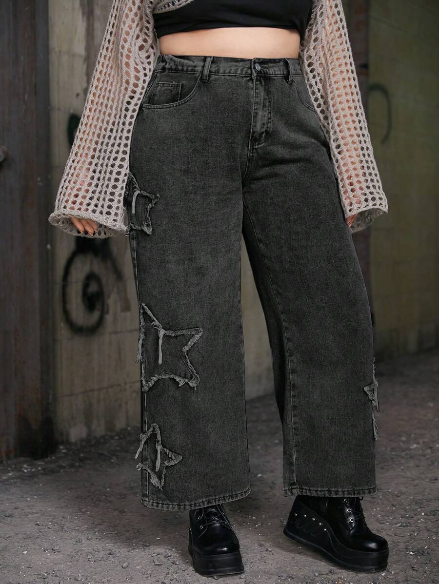 Grunge Punk Plus Size Grunge Style Punk & Subculture Star Patches Wide Leg Straight Jeans