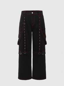 Grunge Punk Plus Size Music Festival Attire Contrast Stitching Metallic Eyelet Detail Loose Straight-Leg Boyfriend Jeans, School