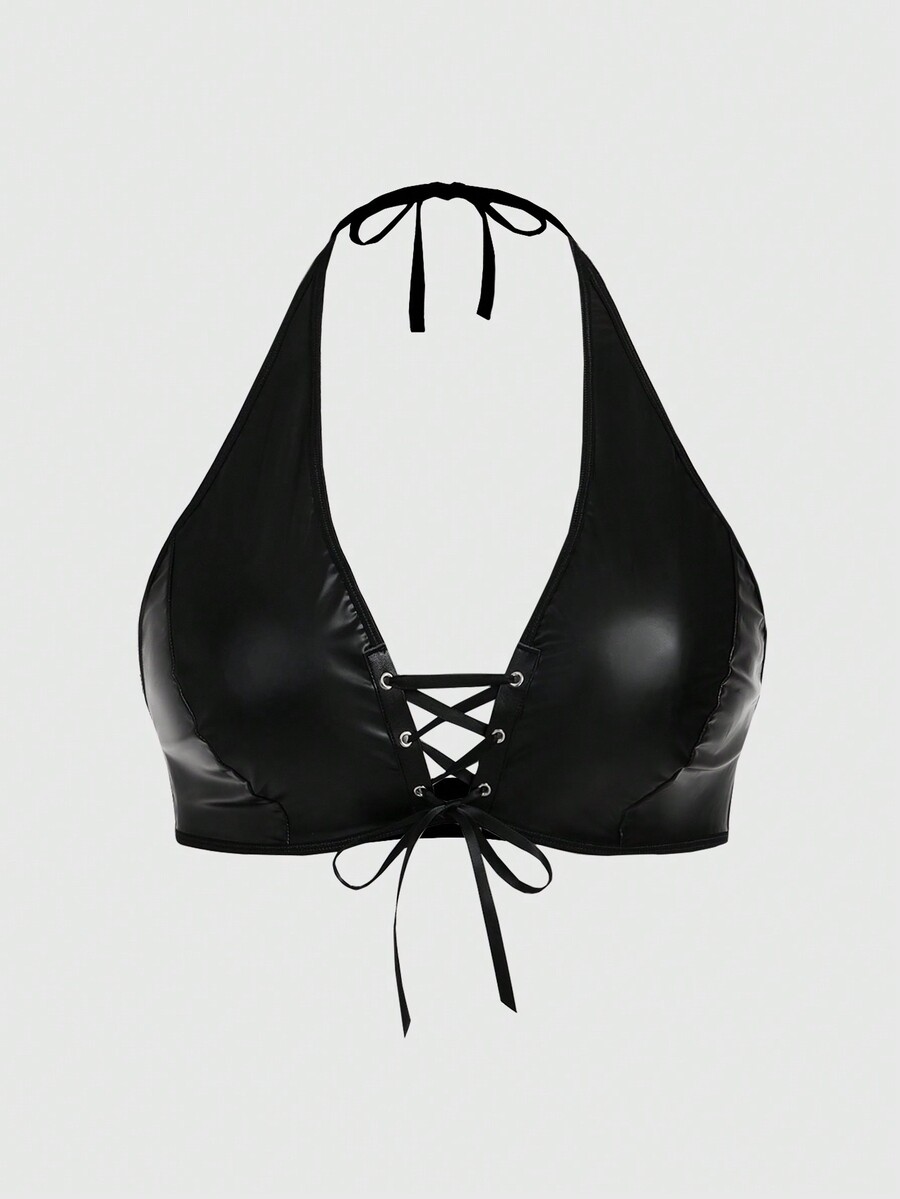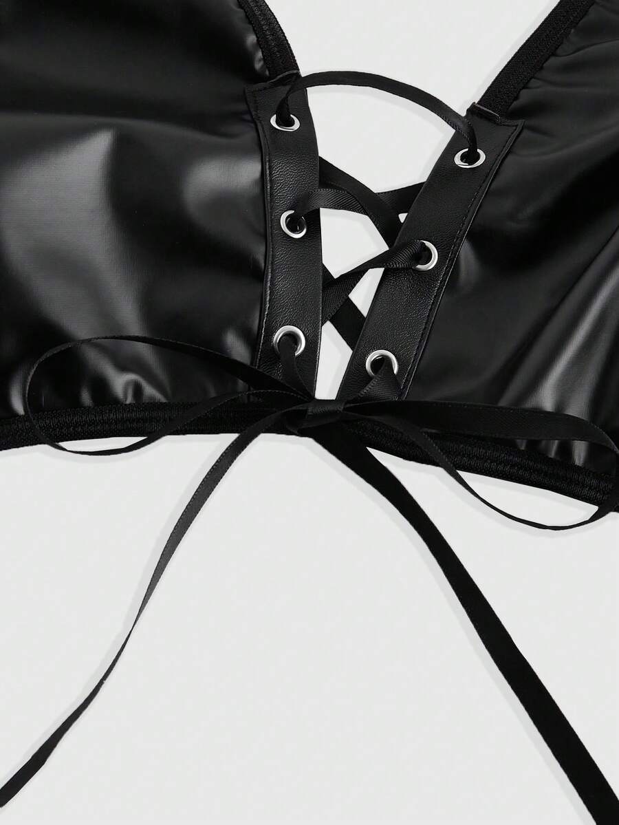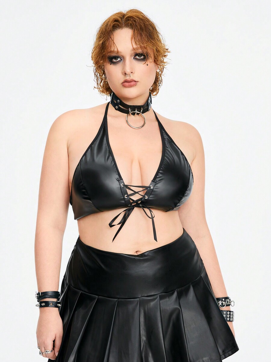Grunge Punk Plus Size Punk Style Cross Strap Halter Pu Leather Harness Bra Top