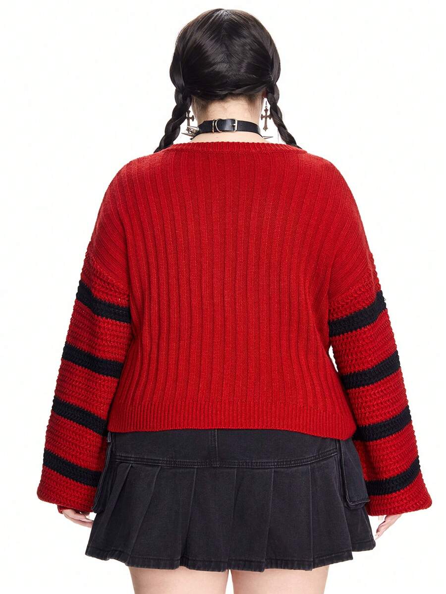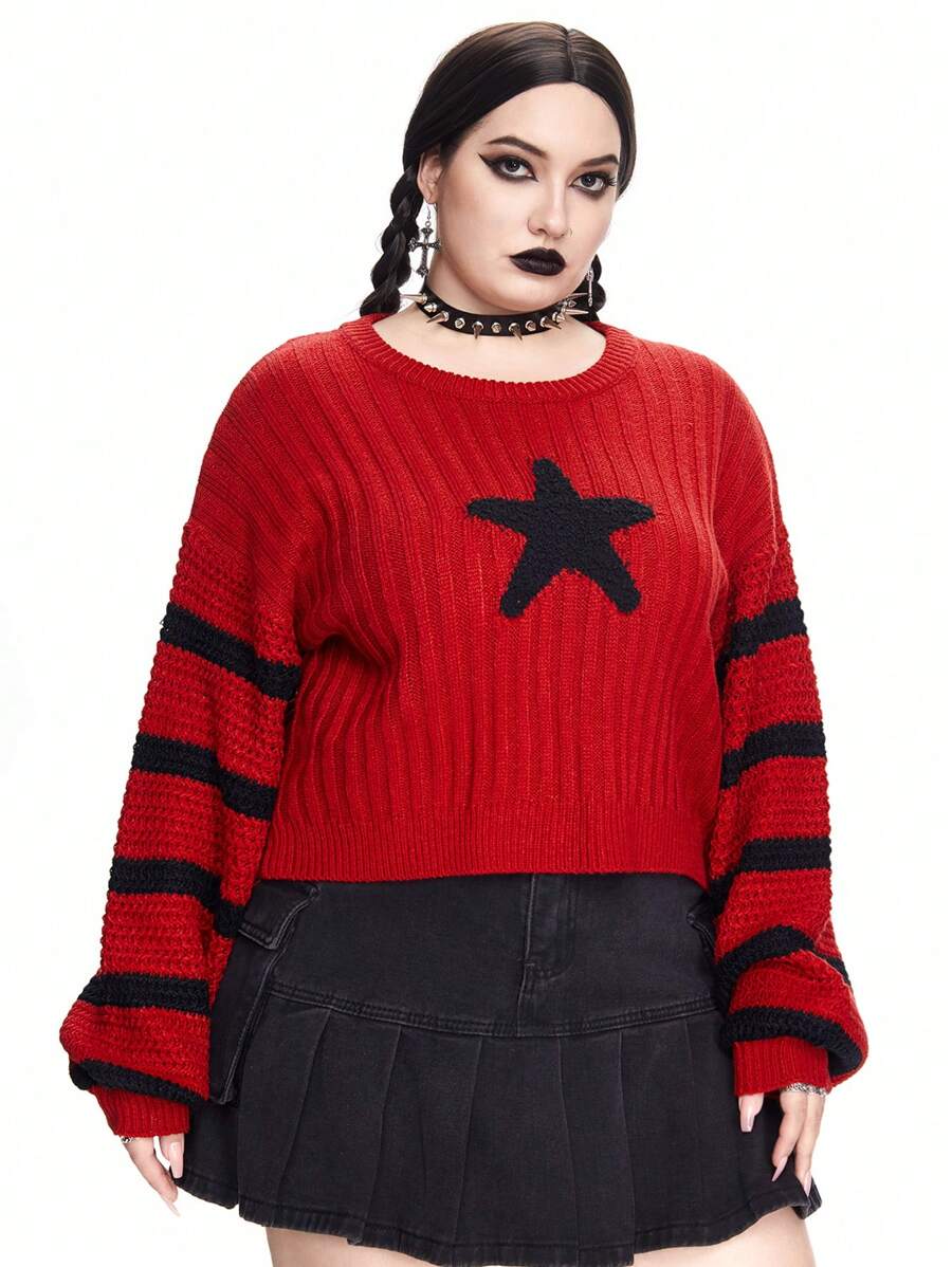 Grunge Punk Plus Size Women Punk Goth Style Star Embroidery Striped Cropped Pullover Sweater