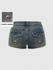 Grunge Punk Plus Size Women Punk Style Skeleton Wings Embroidery & Rhinestones Decor Denim Shorts
