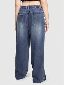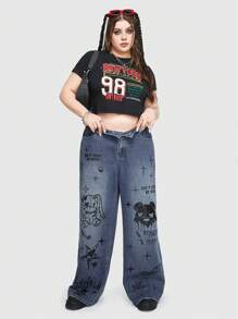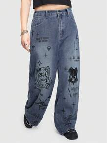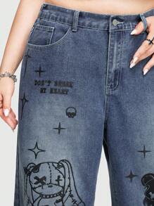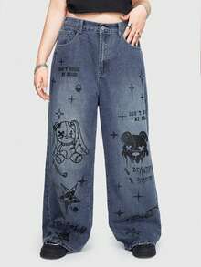 Grunge Punk Plus Size Women'S Casual Fun Slogan Cartoon Bear Print Wide Leg Jeans
