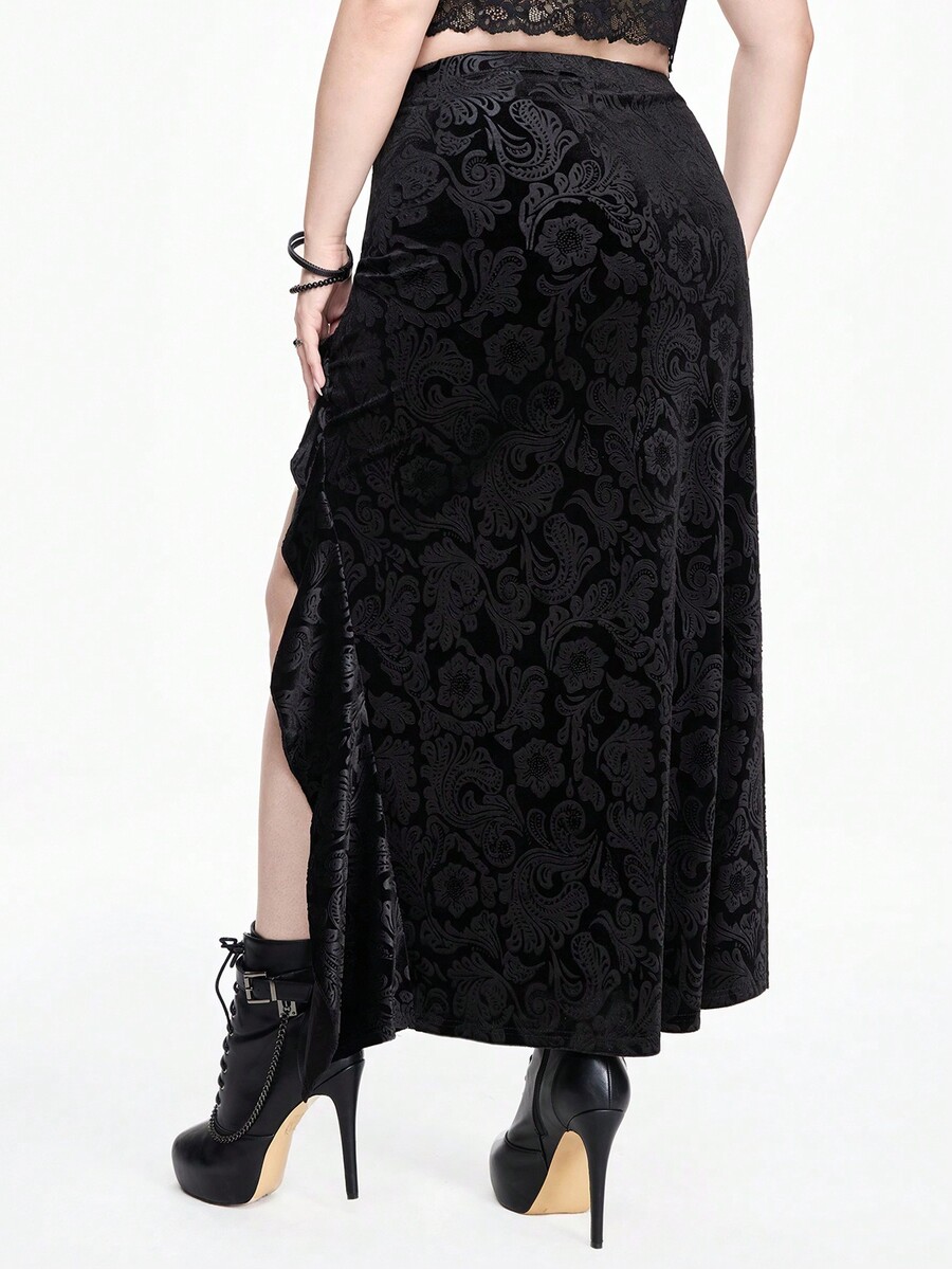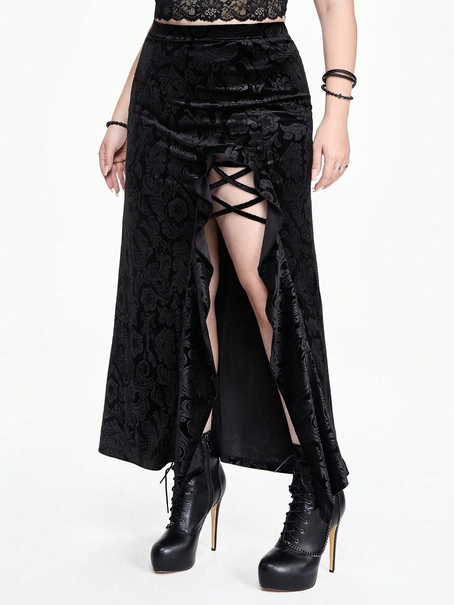 Grunge Punk Plus Size Women Solid Color Cross-Tied Split Hem A-Line Skirt