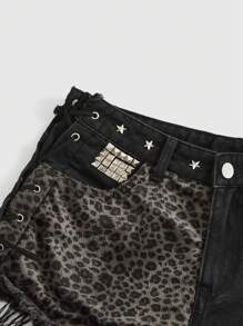 Grunge Punk Plus Size Women Street Chic Vintage Y2K Ultra Mini Denim Skirt With Rivet, Distressed Leopard Print Patchwork, Low Waist
