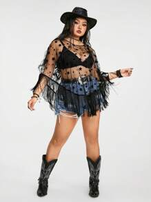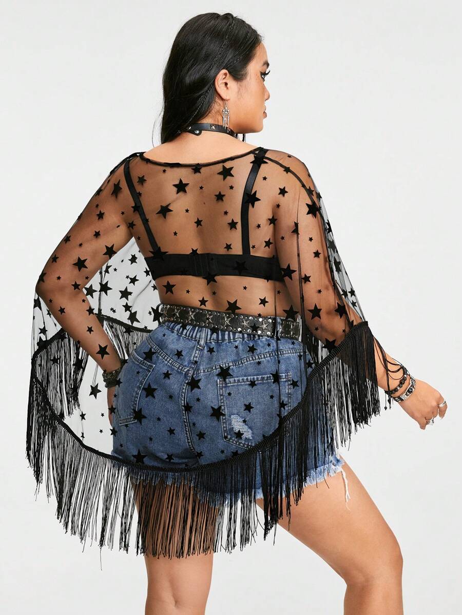 Grunge Punk Plus Size Women's Dark Western Style Loose Top With Fringe Hem, Five-Star Applique And Sheer Mesh, Suitable For Summer