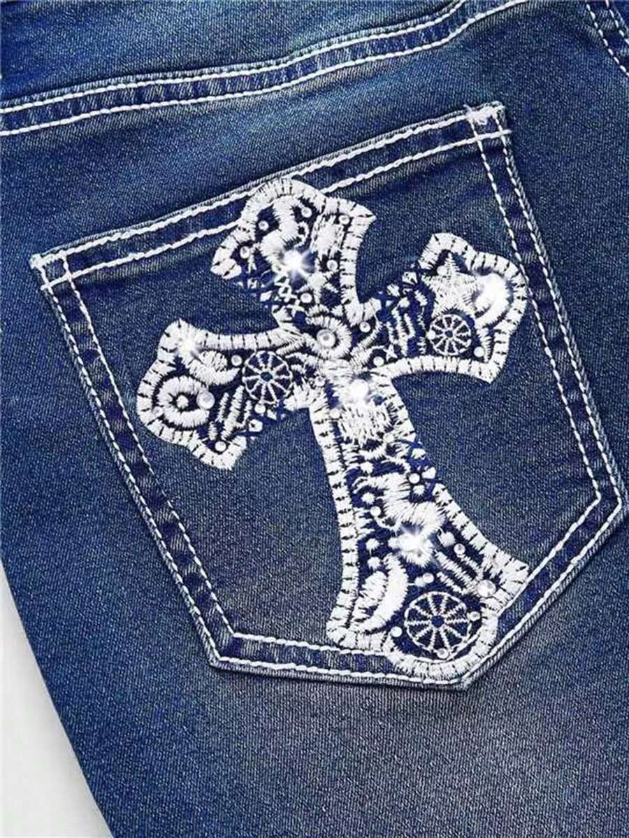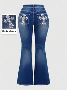 Grunge Punk Plus Size Women's Embroidered Cross Pocket Flared Casual Jeans, School