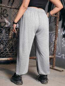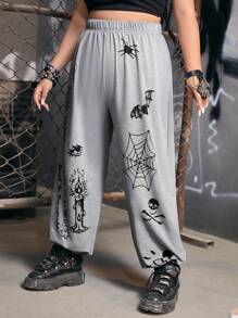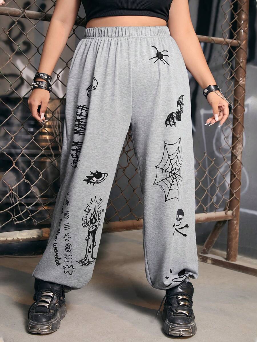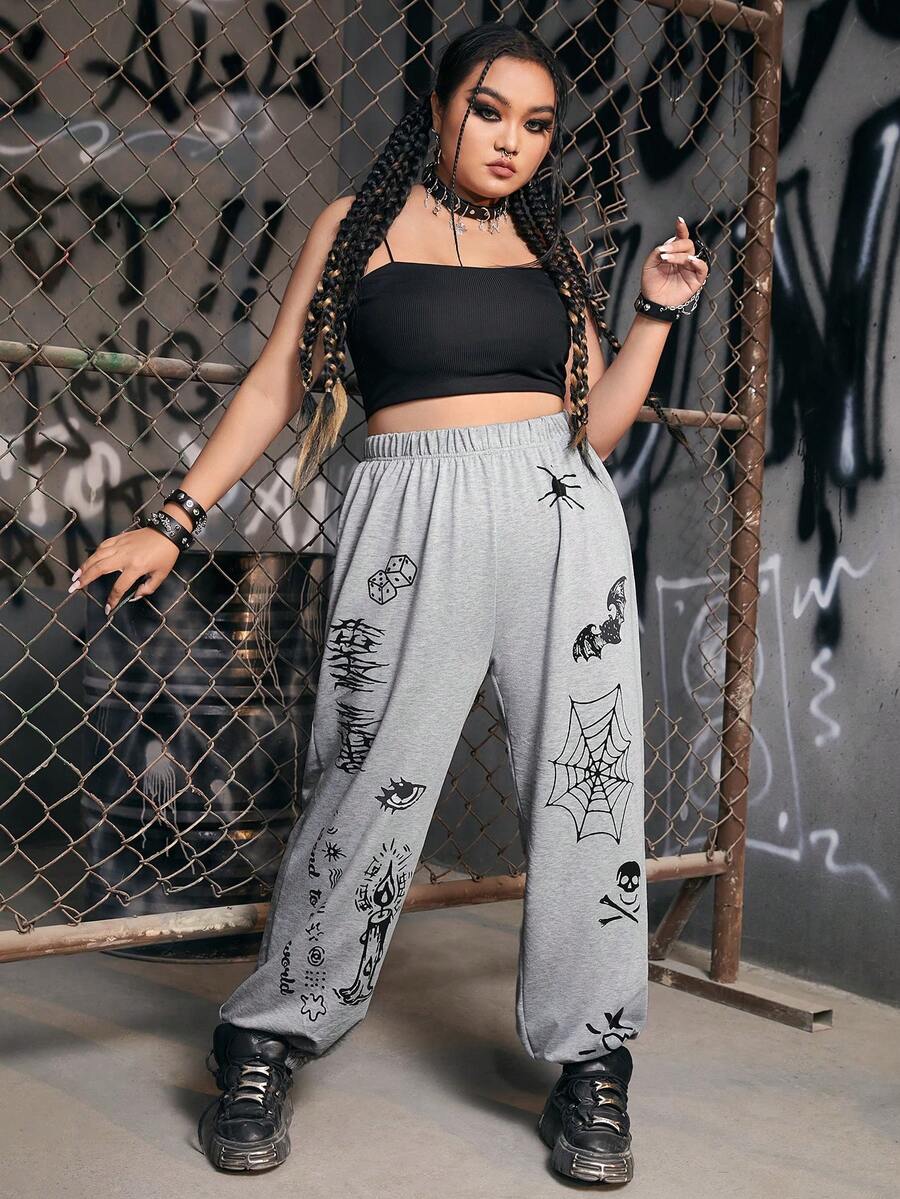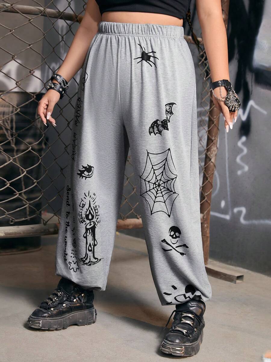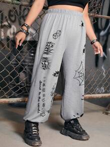 Grunge Punk Plus Spider Web & Skull Print Sweatpants