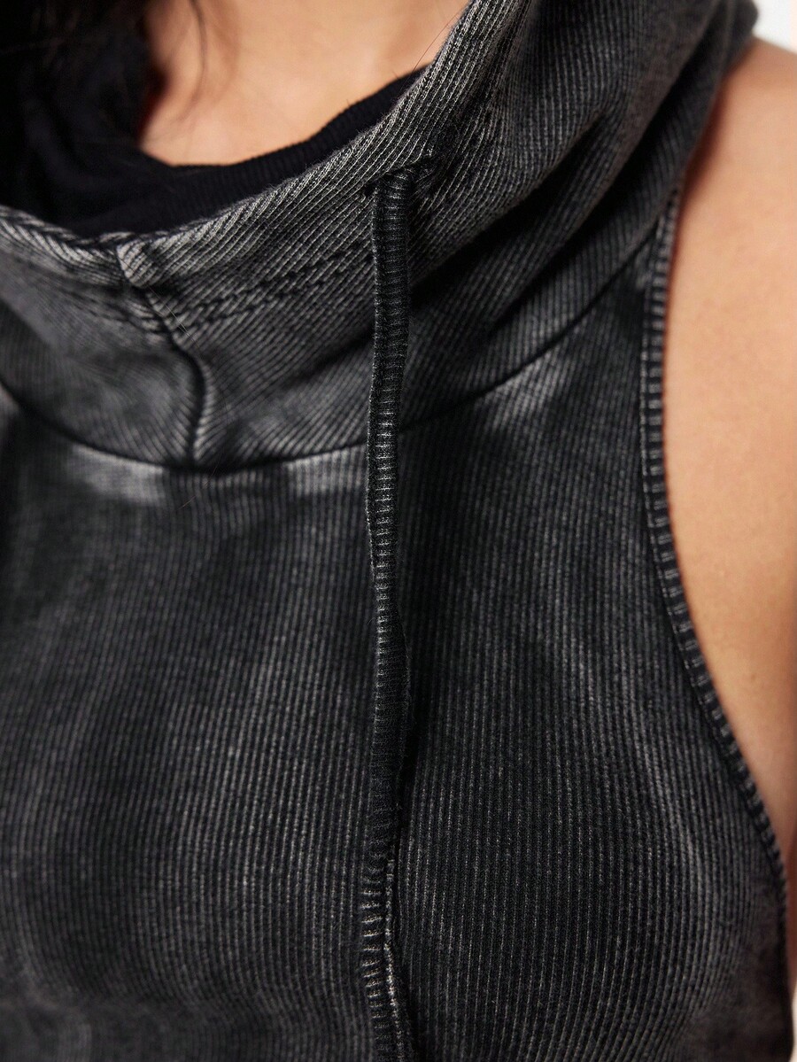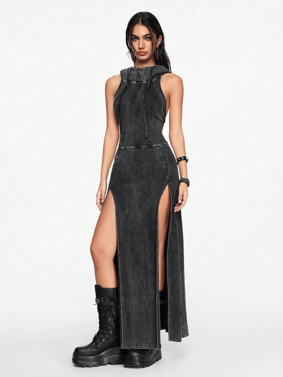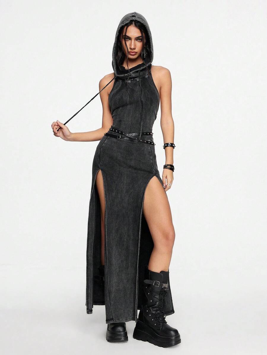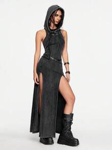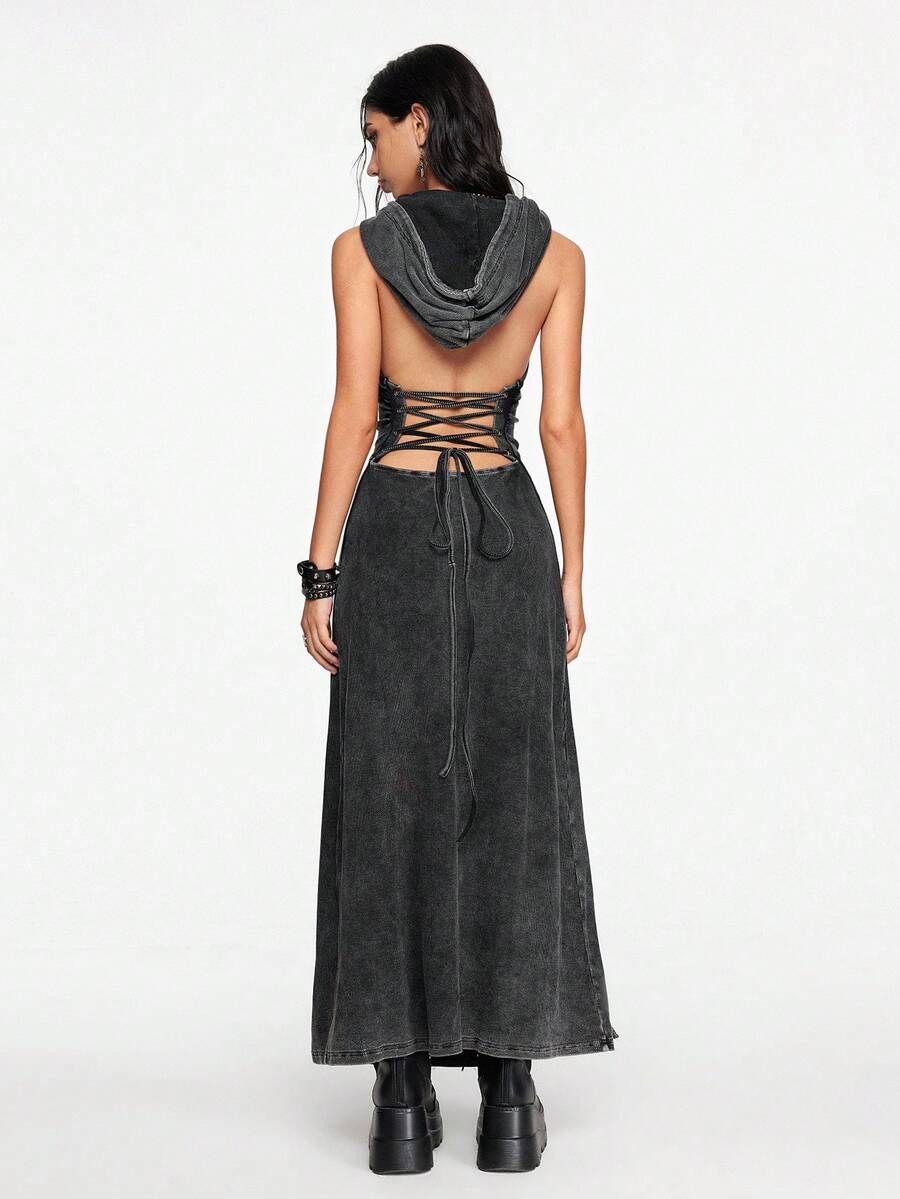 Grunge Punk Punk Apocalyptic Wasteland Music Festival Outfit Hooded Backless Lace-Up High Slit Distressed Snowflake Fitted Dress For Women