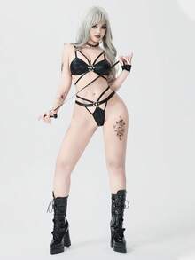 Grunge Punk Punk PU Triangle Cup Bra And Thong Lingerie Set, Sexy And Intimate