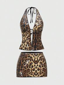 Grunge Punk Punk Rock Chic Summer Beach Party Outfit, Festival Music Event Street Fashion, Y2K Millennium Halter Sexy Leopard Sequin Cross Pendant Women Set