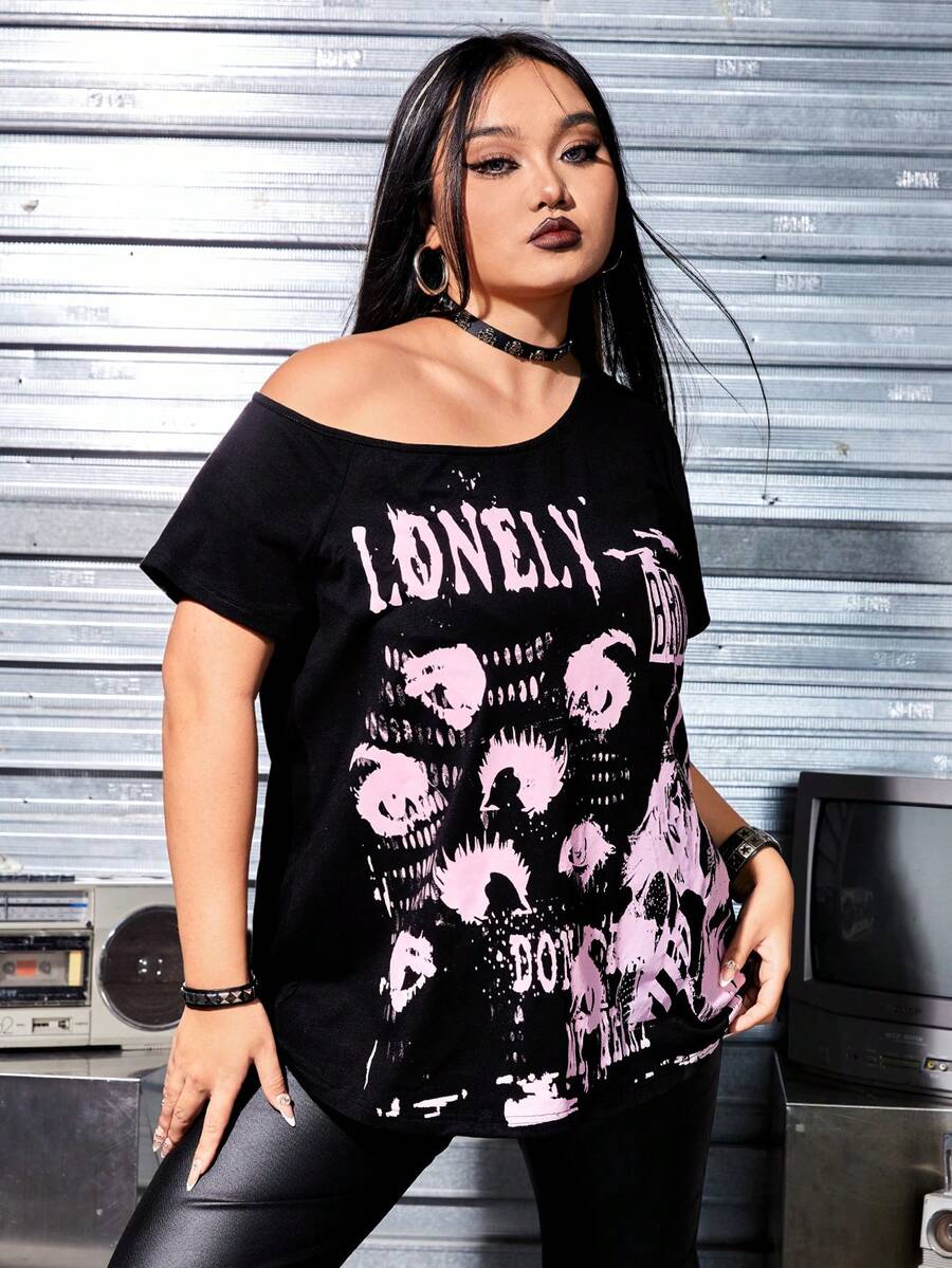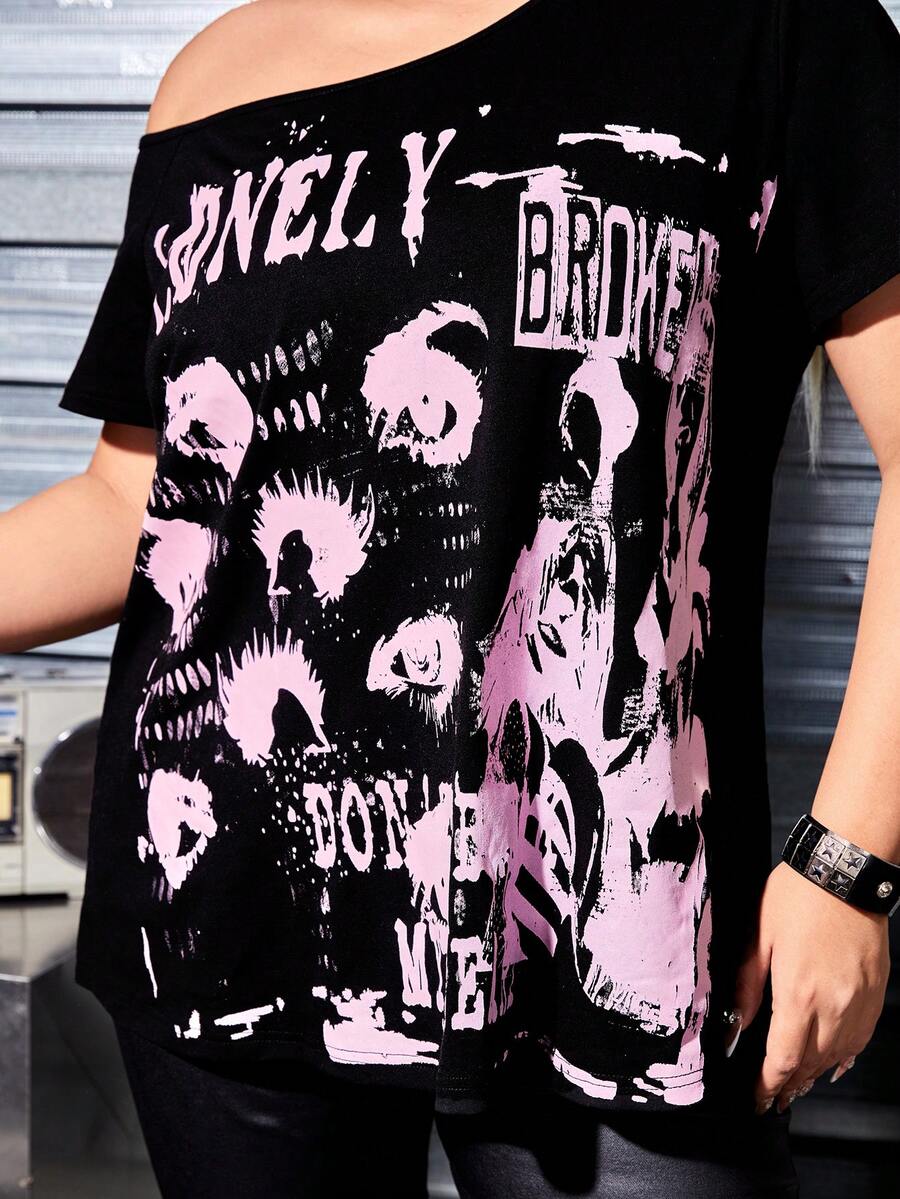 Grunge Punk Punk Streetwear Loose Fit Short Sleeve T-Shirt With Printed Face And Eye Elements, Oblique Shoulder And Collar Design