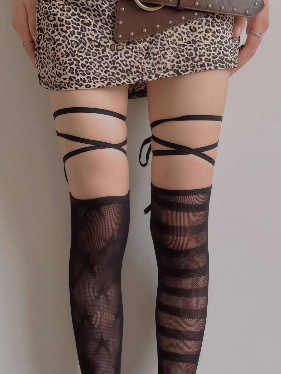 Grunge Punk Punk Style Asymmetric Hollow Pattern Star Striped Lace-Up Thigh High Socks, Y2K Fashion Versatile For Party, Gathering, Music Festival