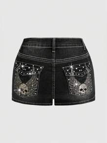 Grunge Punk Punk Wings & Skull Embroidered Rhinestone Decor Plus Size Women Black Denim Shorts
