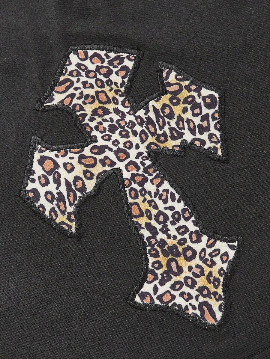 Grunge Punk Retro Leopard Print Cross Embroidery Foldover Off Shoulder Slim Fit T-Shirt, School