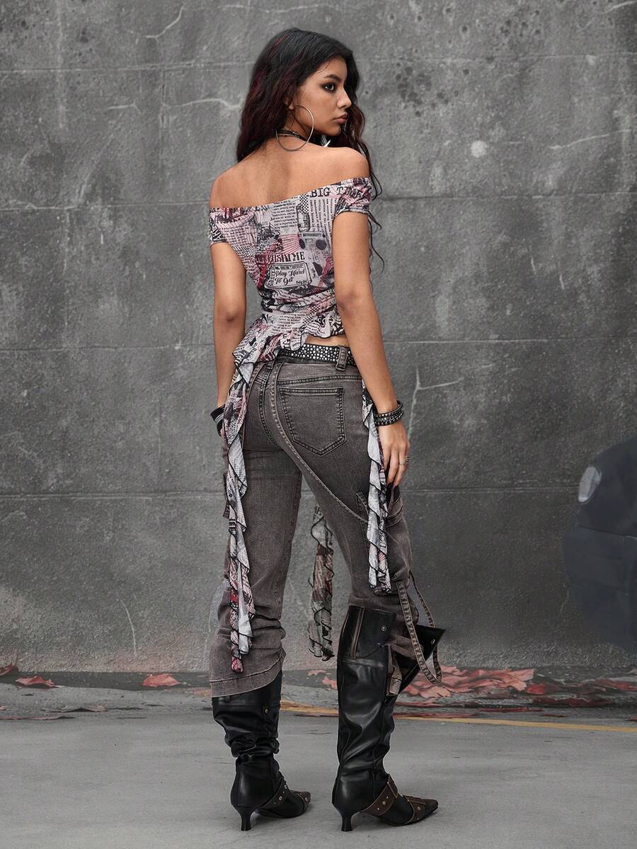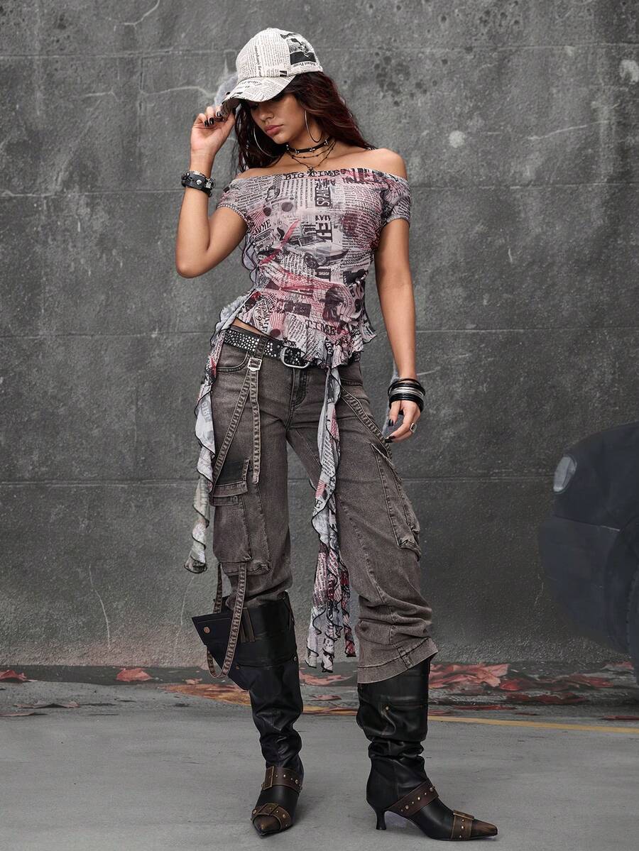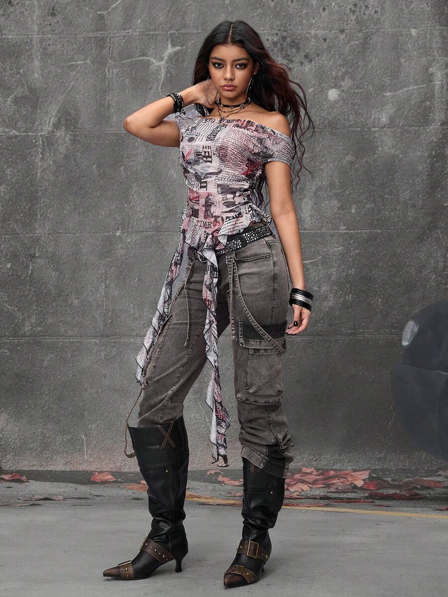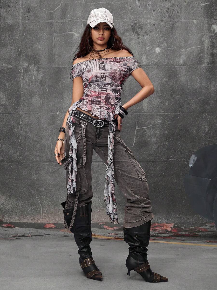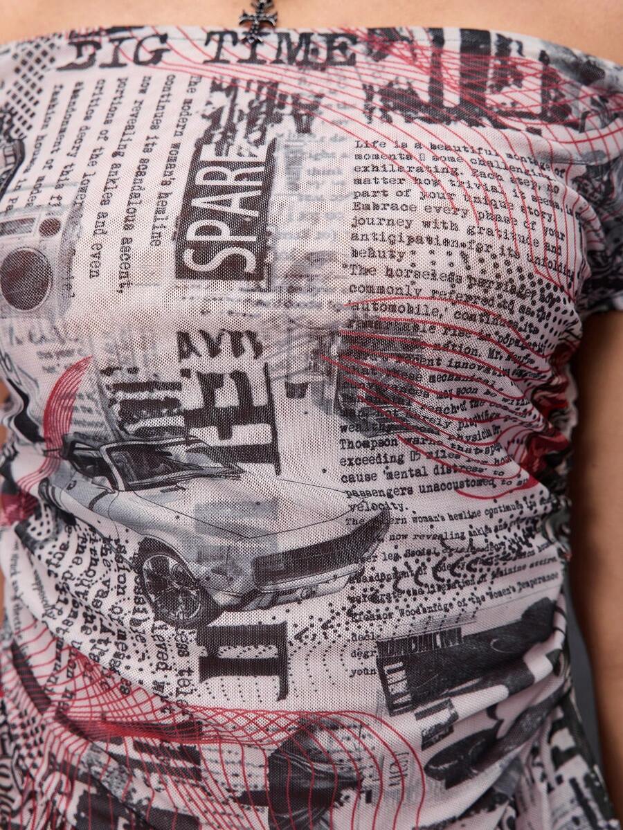 Grunge Punk Retro Urban Chic Portrait Newspaper Print Off Shoulder Waist Ruched Asymmetrical Hem Bodycon Mesh Top