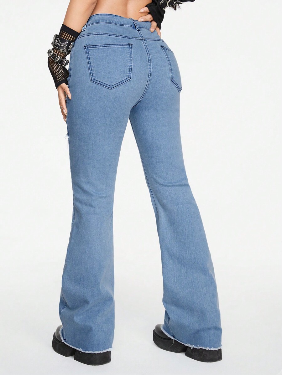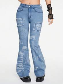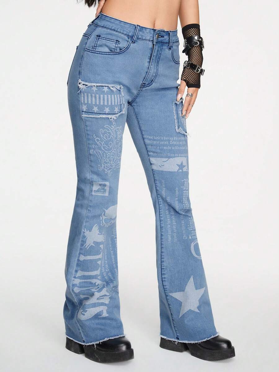 Grunge Punk Slim Fit Stretch Denim Flared Pants With Punk Vine, Skull, Star & Floral Print