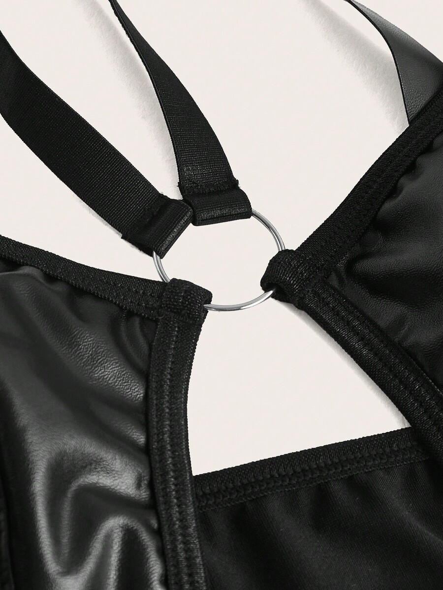 Grunge Punk Solid PU Cut Out Ring Linked Harness Bra