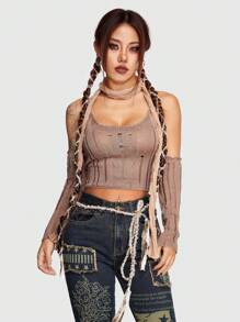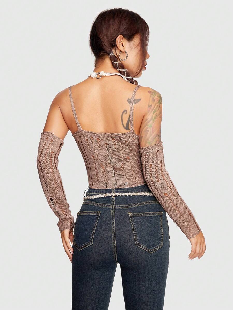 Grunge Punk Solid Ripped Crop Cami Knit Top With Arm Sleeves
