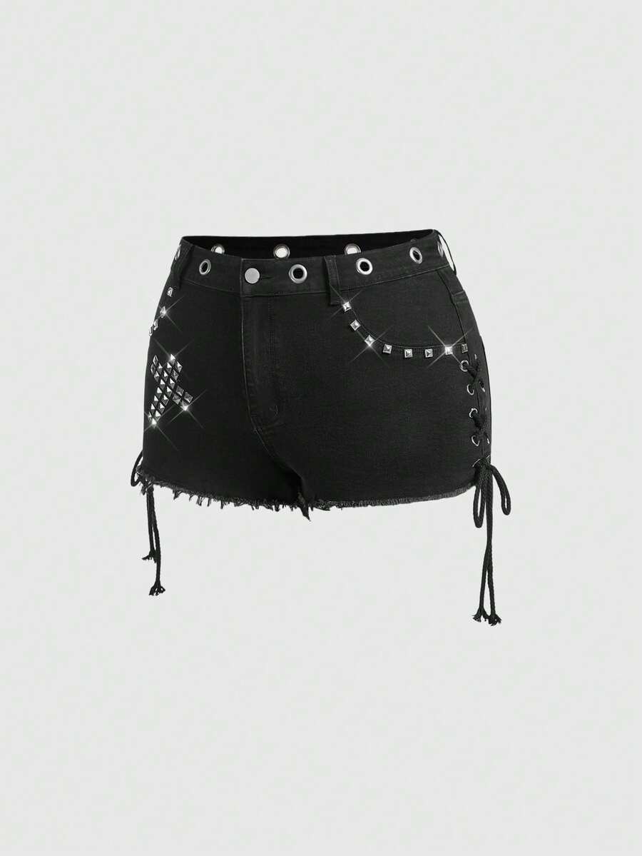 Grunge Punk Spring/Summer Plus Size Women Dark Cross Rivet Vintage Lace-Up Low Waist Distressed Denim Shorts