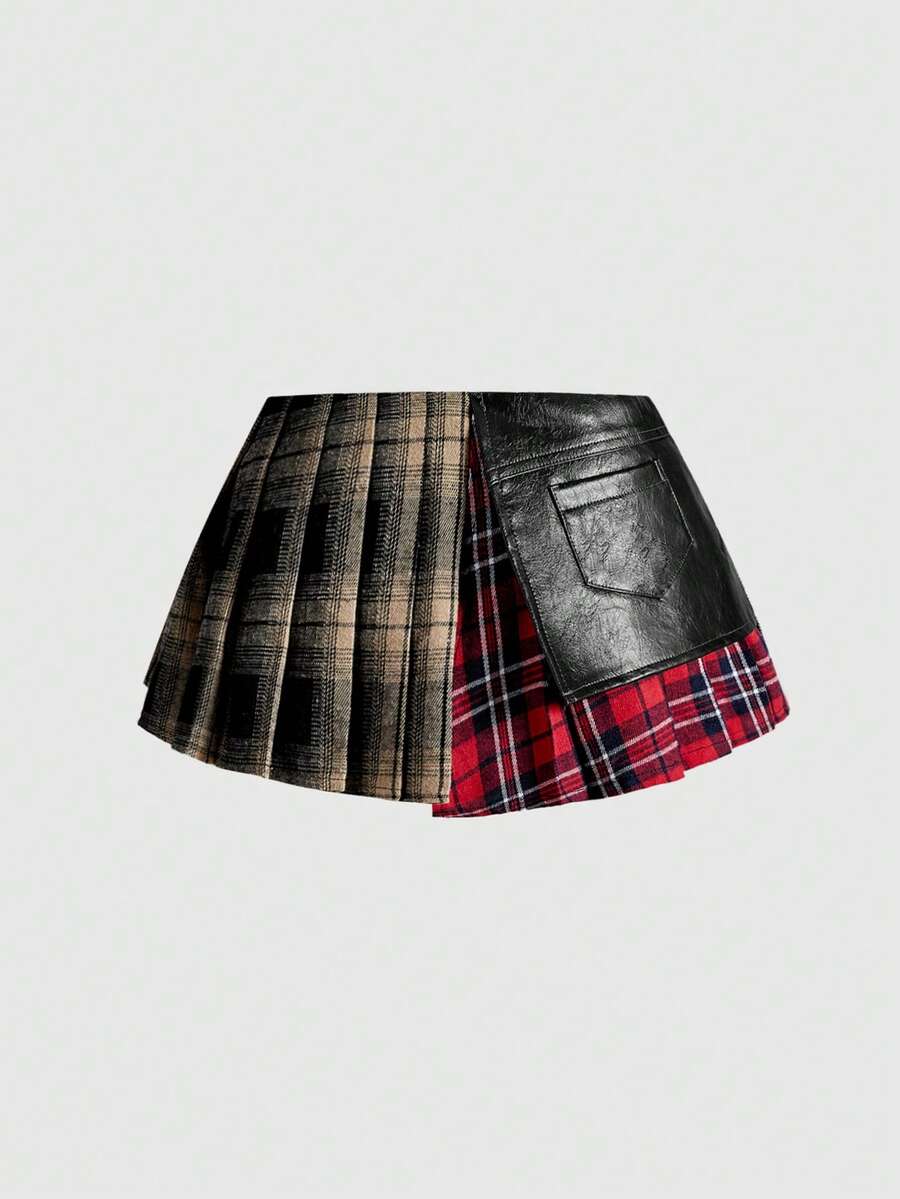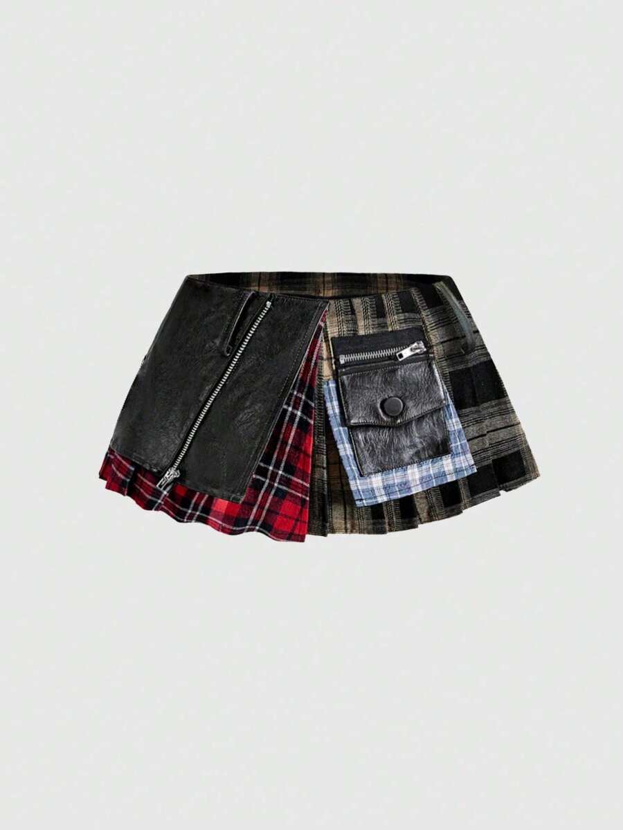 Grunge Punk Spring/Summer Plus Size Women Plaid Patchwork Asymmetric Hem A-Line Skirt